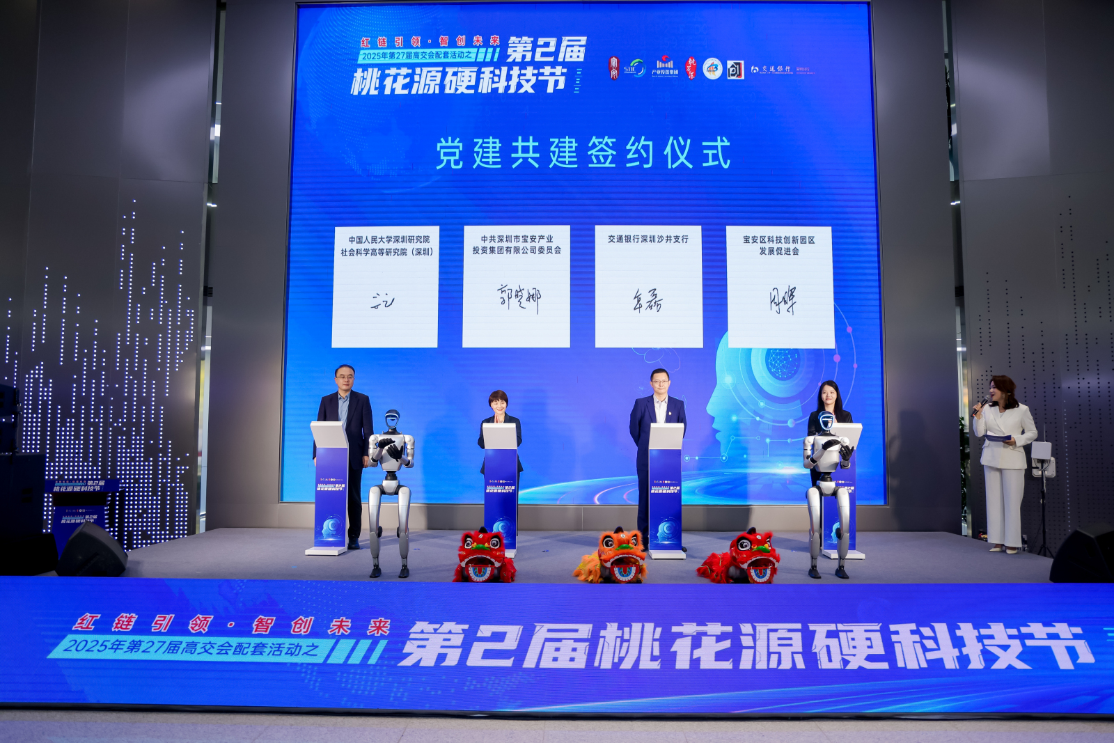 本届硬科技节特别设置党建共建签约环节,宝安产业投资集团党委与中国人民大学深圳研究院〔社会科学高等研究院(深圳)〕、宝安科创园区促进会、交通银行宝安分行共同签约,构建资源共享、优势互补的党建新格局,为党建引领产业高质量发展注入新动能。