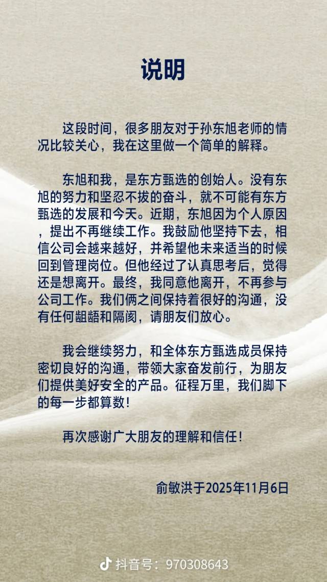 11月6日,俞敏洪发文确认孙东旭离职。俞敏洪在说明中提到:东旭和我,是东方甄选的创始人。没有东旭的努力和坚忍不拔的奋斗,就不可能有东方甄选的发展和今天。近期,东旭因为个人原因提出不再继续工作。👉新闻详情
