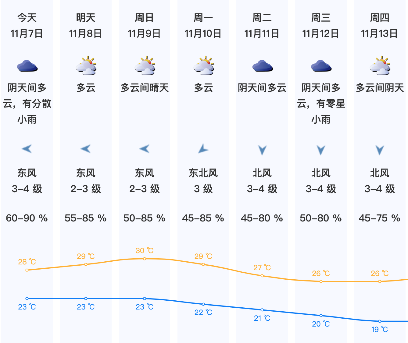 展望10-13日受偏北风影响,多云间阴天,间中有分散小雨,气温逐日下降,天气逐渐转凉。