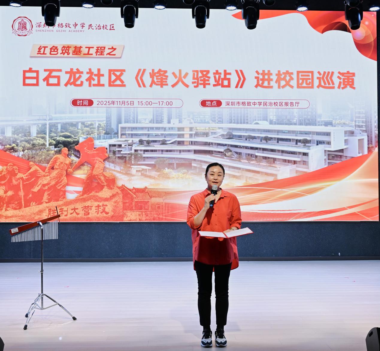 深圳新闻网2025年11月7日讯(记者 何亚南)11月5日下午,深圳市格致中学民治校区报告厅内掌声如潮,白石龙社区原创红色话剧《烽火驿站》进校园巡演暨学校艺术教育成果展演在此成功举行。本次活动深度融合红色文化传承与艺术教育展示,既是学校“红色筑基工程”的生动实践,也是对校社共建共育模式的一次深入探索。