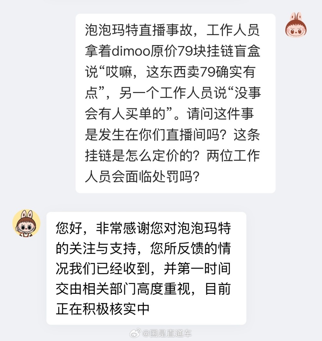对此,小编问询涉事直播间。该直播间回应称:非常感谢您对泡泡玛特的关注与支持,您所反馈的情况我们已经收到,并第一时间交由相关部门高度重视,目前正在积极核实中。而对于所提到的79元的商品价格是否会调整,客服表示暂没收到通知。