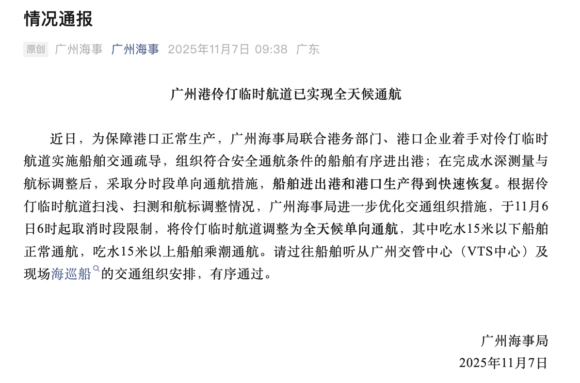 11月7日早上,广州海事局发布情况通报称,广州海事局进一步优化交通组织措施,于11月6日6时起取消时段限制。