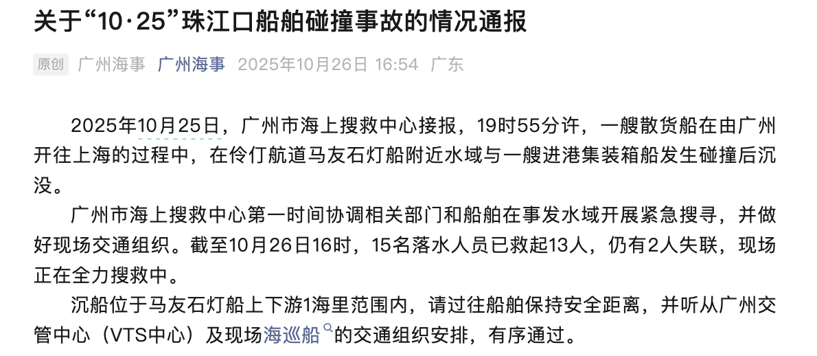 10月25日,广州市海上搜救中心接报,19时55分许,一艘散货船在由广州开往上海的过程中,在伶仃航道马友石灯船附近水域与一艘进港集装箱船发生碰撞后沉没。