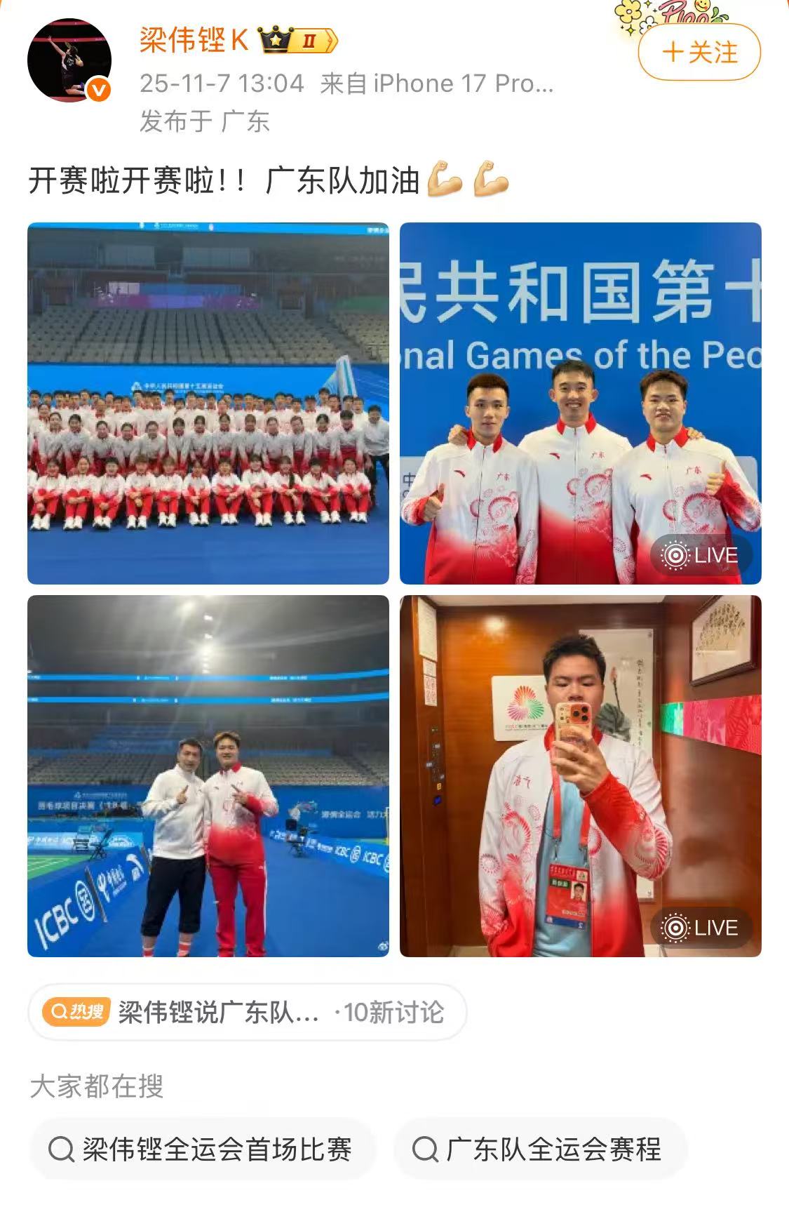开赛当天,梁伟铿发博为广东队加油。