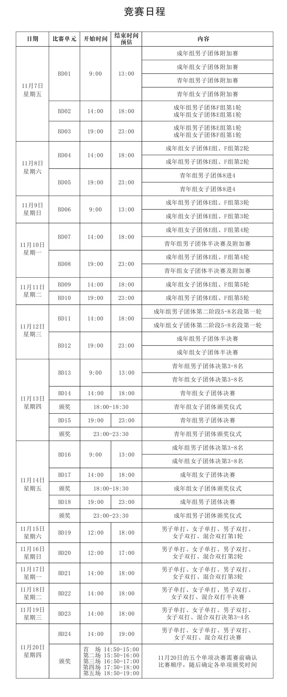 7日至14日为团体赛。其中,青年组团体赛金牌将在13日晚产生,成年组团体冠军将在14日晚揭晓;