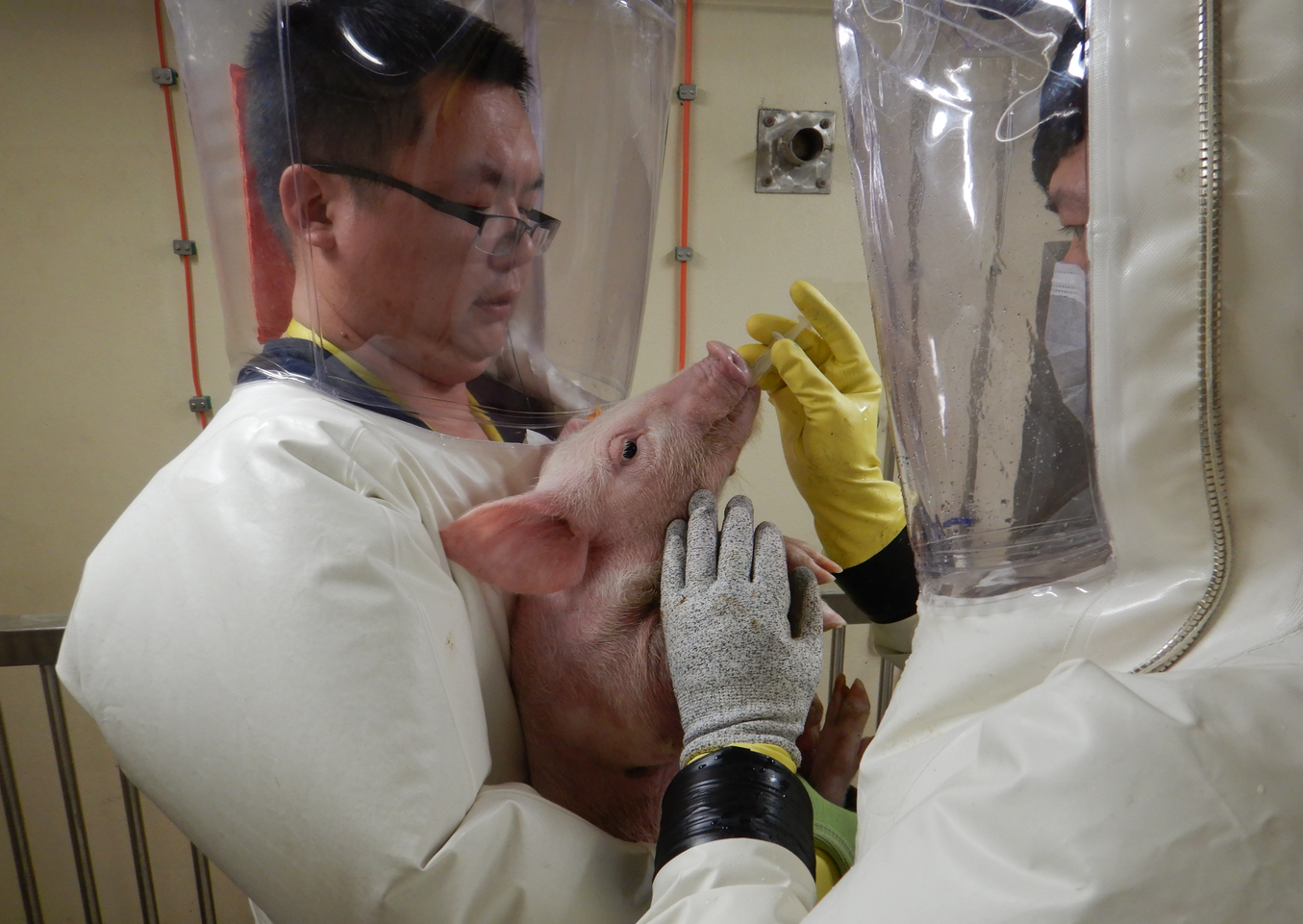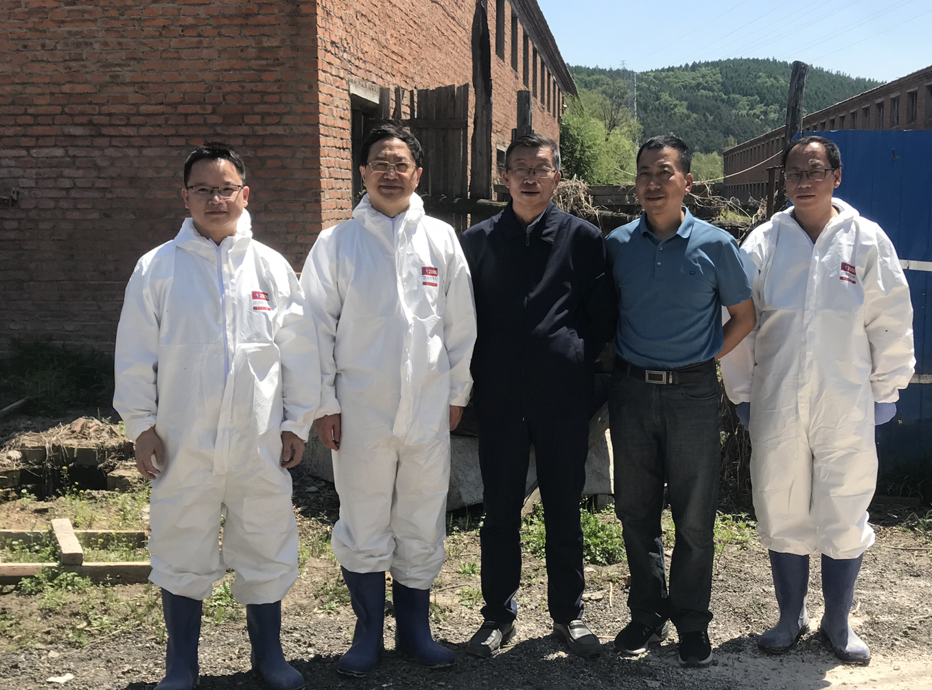 哈兽研所长步志高(左二)在非洲猪瘟弱毒疫苗临床试验基地开展动物实验