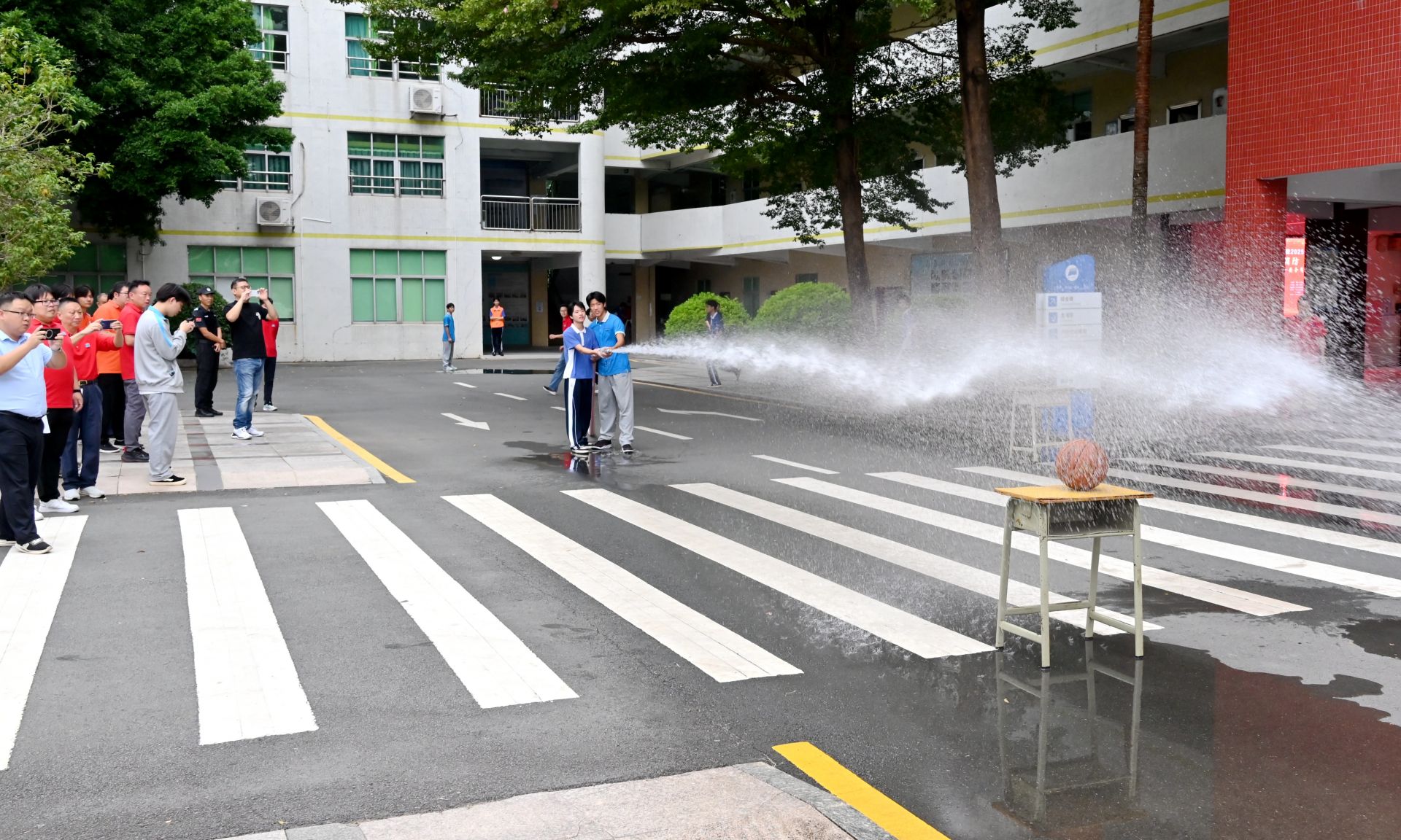 与此同时,抢险救援组迅速抵达“火灾”现场,展开初期扑救;医疗救护组对“受伤”学生实施紧急处理。整个流程衔接紧密、响应迅速,充分展现了学校应对突发事件的综合处置能力。