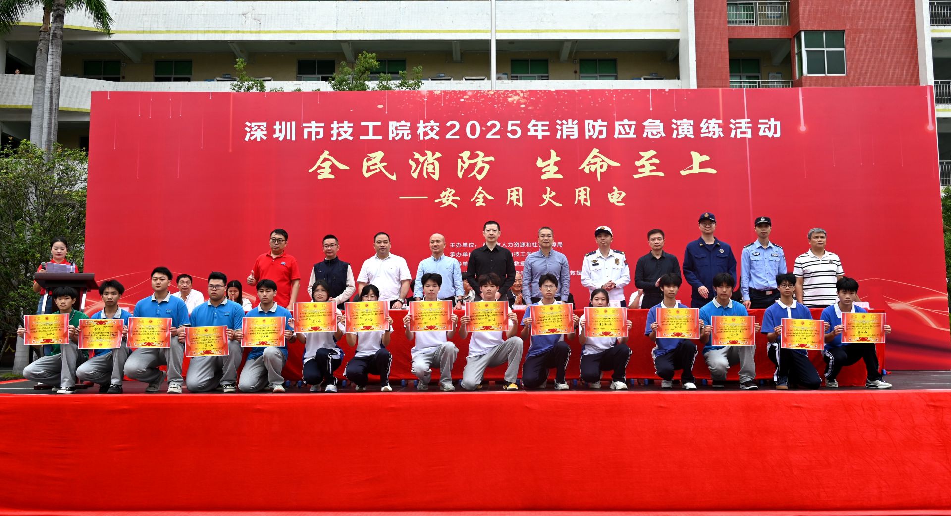 此次活动由深圳市人力资源和社会保障局主办、宝山技工学校承办,活动涵盖了紧急疏散救援演练、消防技能运动会和消防宣传游园活动三大板块,市人力资源和社会保障局、市消防救援局、坪山区人力资源局等相关负责人,以及全市各技工院校、职业培训机构代表和宝山技校师生共同参与了这场“沉浸式”安全教育课。