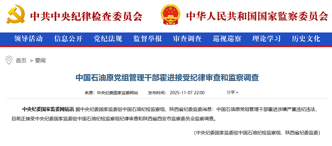 中国石油原党组管理干部霍进涉嫌严重违纪违法,目前正接受中央纪委国家监委驻中国石油纪检监察组纪律审查和陕西省西安市监察委员会监察调查。