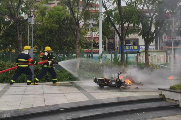 在六和城商业广场的模拟火灾演练区(模拟电动自行车电池着火),只见浓烟从模拟电动车中涌出,火苗迅速窜起。这是由六和城义务消防队开展的“真灭火、真动作”实操实训。队员们反应迅速,手持高压水枪冲向火源,规范完成灭火动作,短短数十秒便将“火势”彻底扑灭。随后,消防队员化身“安全向导”,组织群众进行火灾疏散演练。“弯腰低头!用湿毛巾捂住口鼻!沿墙壁快速撤离!”从灭火器使用到疏散路线规划,每个环节都让群众亲身体验到“火灾面前,科学应对才是关键”。