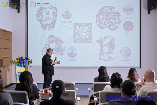 首期活动中,台湾包装设计协会荣誉理事长、台湾楹峰设计有限公司负责人黄国洲作为创意行活动的深度参与者与推动者,以卓越的设计理念,打造了首份具有深台特色的伴手礼礼盒设计。在今天的成果发布环节,他以《创意联动两岸:深台创意行活动成果发布》为主题介绍了该礼盒的设计理念。黄国洲提到,该设计结合“台湾”与“深圳”两地代表性的文化图腾与饮食特色,例如将台湾珍珠奶茶、台北101等特色元素融入“台”字,将深圳市民中心、人才公园等元素纳入“深”字,透过传统版画风格构成“台”与“深”两字,象征两地的合作与深度连结,也让礼盒从视觉上直接传达文化与情感交流的意涵,成为连接深台两地文化、促进两岸民众相互了解的对话桥梁。