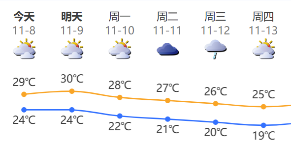 11-12日多云到阴天,间中有小雨,气温下降,天气转凉;