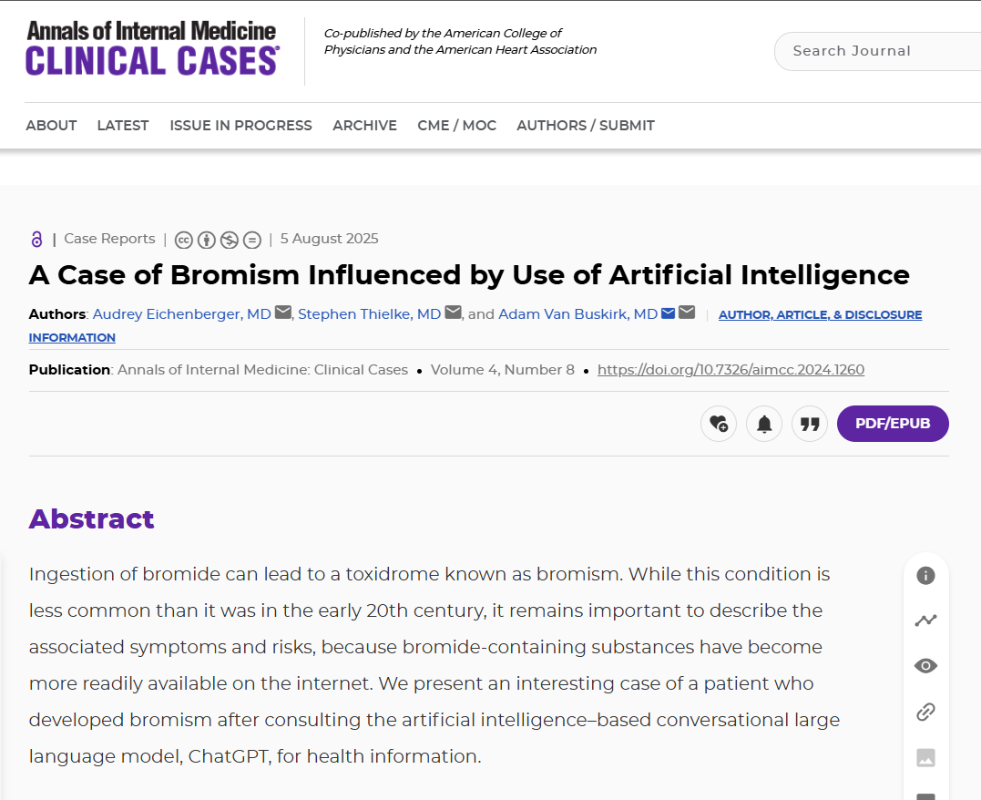 医学期刊《内科学年鉴》里面报道了一则病例:一名60岁男性因听信ChatGPT的建议,用从网上购买的溴化钠替代食盐3个月,导致严重的溴中毒。