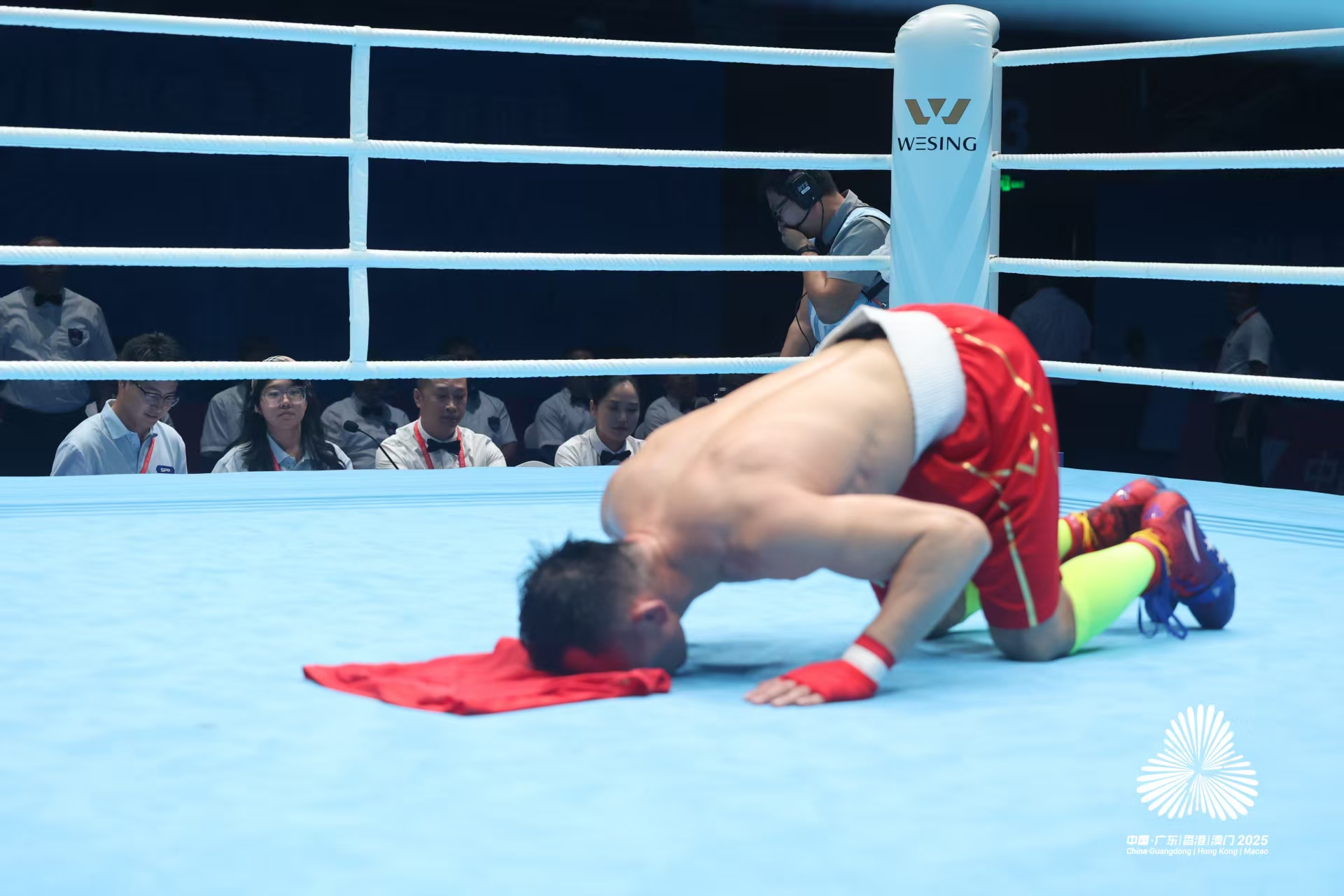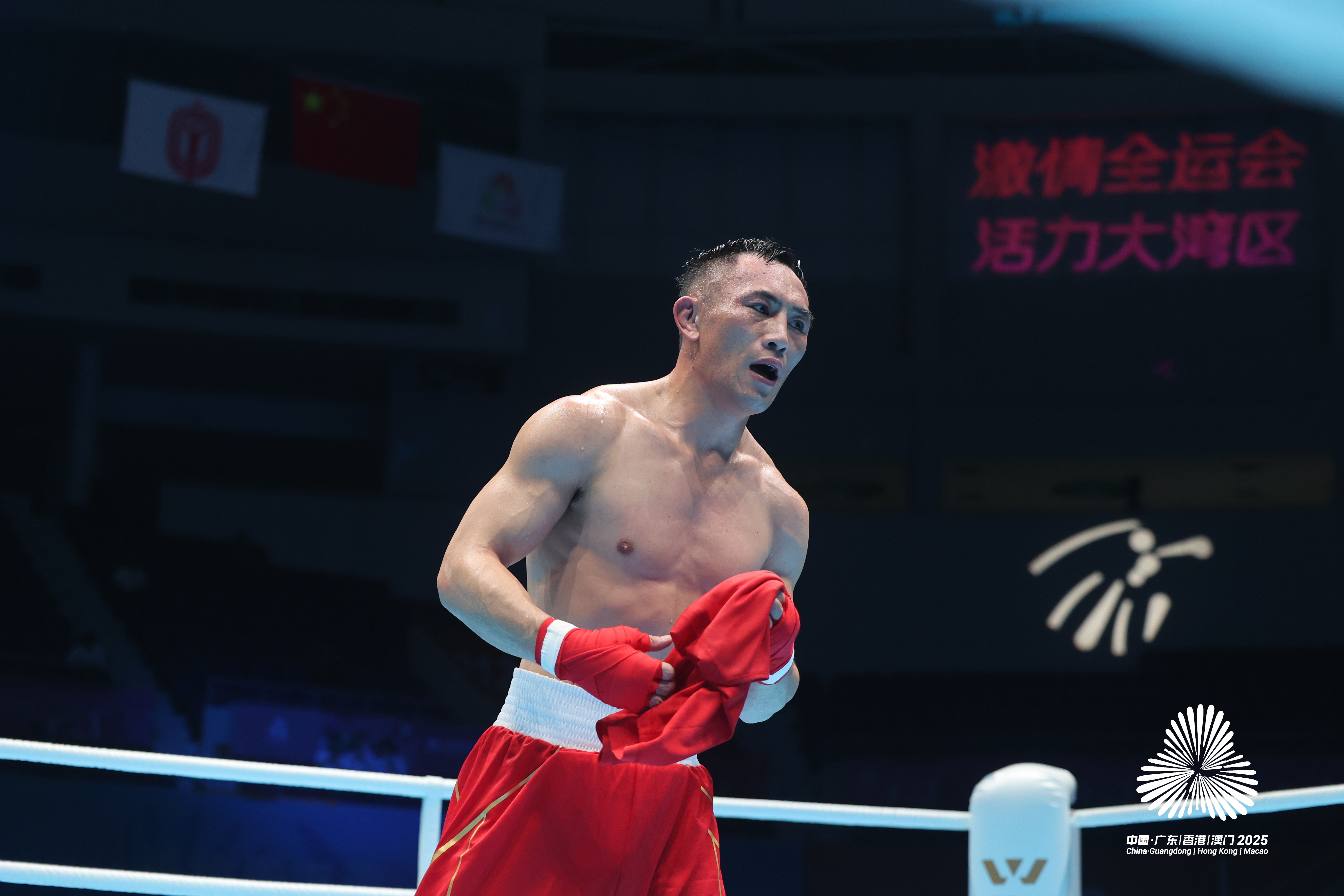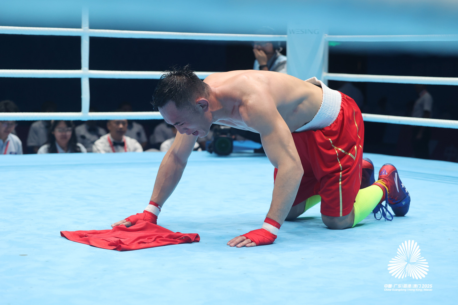 第五次征战全运会的湖北队38岁老将刘伟,在不敌浙江队刘培成后,脱下拳服,将其工整叠好放在拳台正中央,然后双膝跪地,深吻拳台。他以此告别自己五届全运会的征途,也告别25年的拳击生涯。