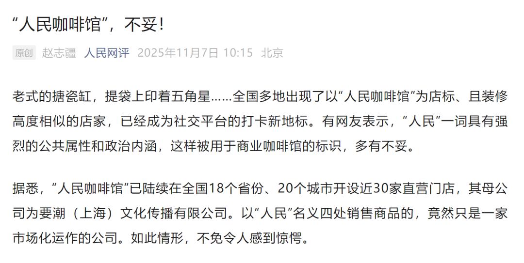 11月7日,人民网评发文《“人民咖啡馆”,不妥!》。