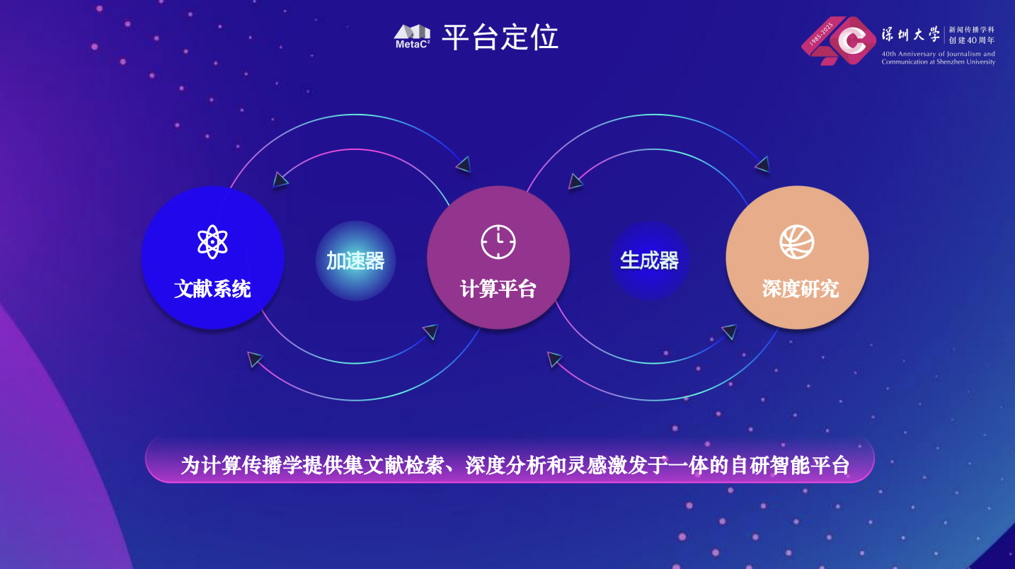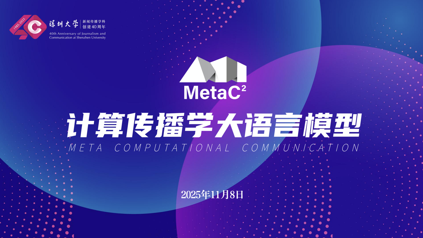随后在成果发布环节,学院重点展示了两项标志性成果:一是“中国改革开放新闻数据平台”,该平台初步收集整理新闻、政策、文献、口述史,并融合AI功能,让数据“开口说话”,为相关研究和探索提供强大的数据支撑;二是深圳大学传播学院自主研发的“计算传播学大语言模型”——Meta Computational Communication,简称 Meta C2。该模型深度融合了计算传播学领域的专业文献资源与先进的人工智能技术,能够为研究者提供从文献检索到深度分析的全流程辅助,显著提升了科研效率与创新能力。