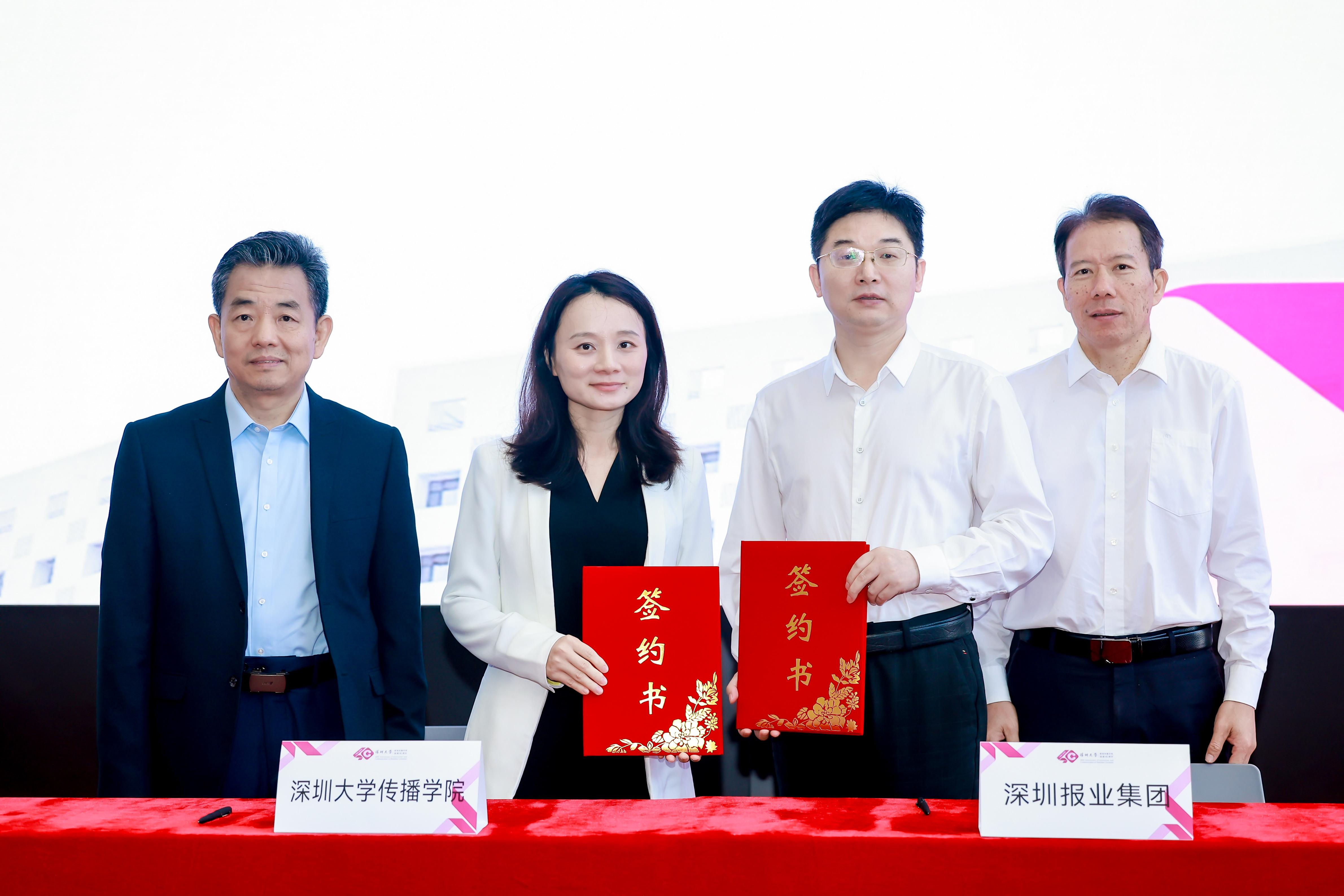 为推动产学研用深度融合,庆祝大会现场举行了一系列战略合作签约仪式。深圳大学传播学院先后与深圳报业集团、深圳广播电影电视集团、腾讯云集团签署了战略合作协议。根据协议,深圳大学传播学院将与深圳报业集团合作创办《融媒前沿》期刊,助力新闻传播学科学研究进一步发展。同时,深圳大学传播学院与深圳报业集团共建“深报传媒学院产教融合平台”,通过业界与学界资源的多维融合,深化校企间高质量合作,预期产出丰硕成果。与深圳广播电影电视集团共同建设并运营“深广电传媒学院”,该集团每年将派出资深编辑、记者、业务骨干等进入深圳大学,参与课程教学、举办前沿讲座、指导毕业设计,实现课堂共享。此外,双方还将联合打造“未来传媒青训计划”,为深圳广电储备人才,助力主流媒体系统性变革。深圳大学传播学院也将与腾讯云集团在智能传播、计算传播等领域开展进一步合作,推动教学内容与行业需求对接,帮助学生更好地适应人工智能时代的社会变革与行业发展趋势。四方将在人才培养、科研合作与实践基地建设等方面开展深度合作,共同探索产学研用协同育人的新路径。