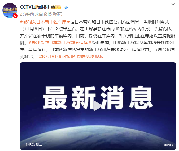 据@CCTV国际时讯 消息,据日本警方和日本铁路公司方面消息,当地时间今天(11月8日)下午2点半左右,在山形县新庄市的JR新庄站站内发现一头熊闯入并滞留在新干线的车辆库内。