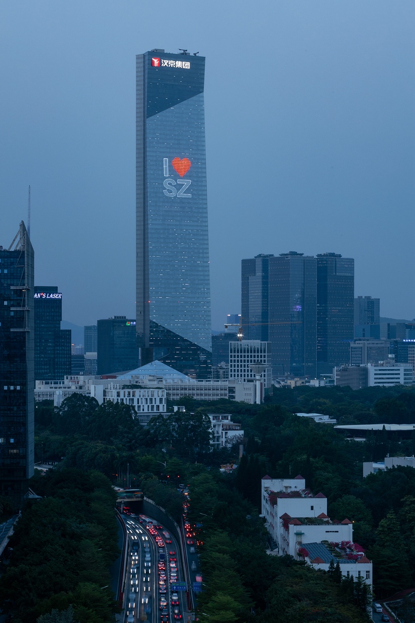 2018年,改革开放40周年。在这一历史节点上,汉京团队做出了一个大胆的决定——在汉京中心楼体南面设置了“I ♥ SZ”的巨型楼体灯光字样。