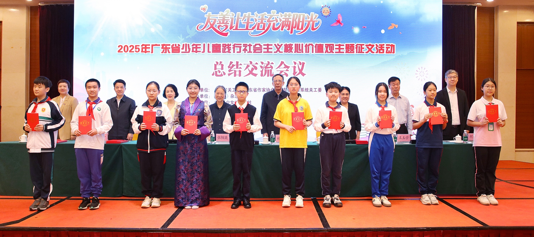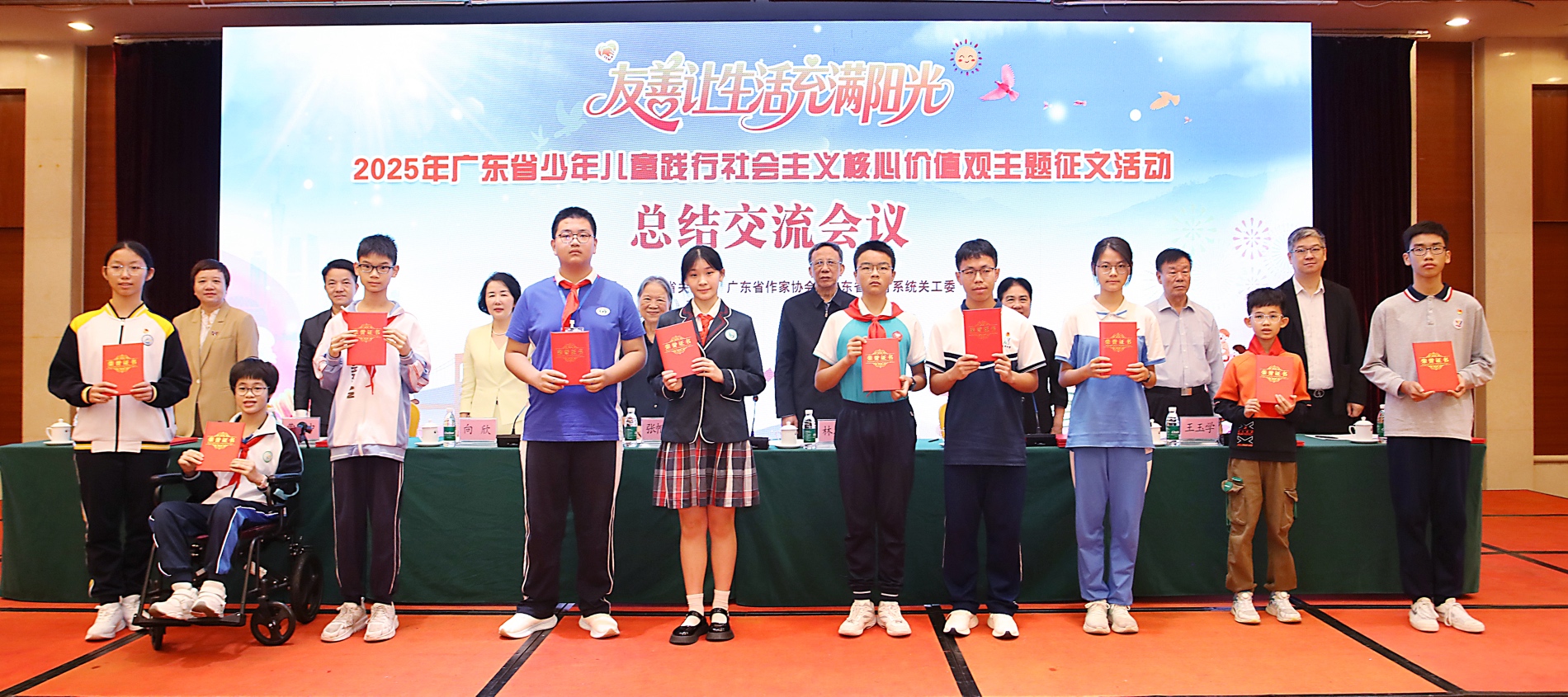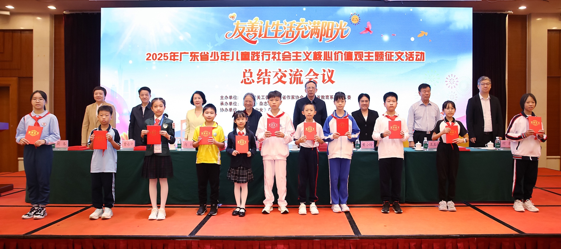11月8日,2025年广东省少年儿童践行社会主义核心价值观主题征文活动总结交流会议在广州举行。广东省关工委名誉主任张帼英、主任林木声,广东省作家协会党组书记、专职副主席向欣,广东省委老干部局副局长曹永中,广东省关工委副主任黄小玲等出席会议,并为获奖学生代表和优秀组织奖单位代表颁奖。