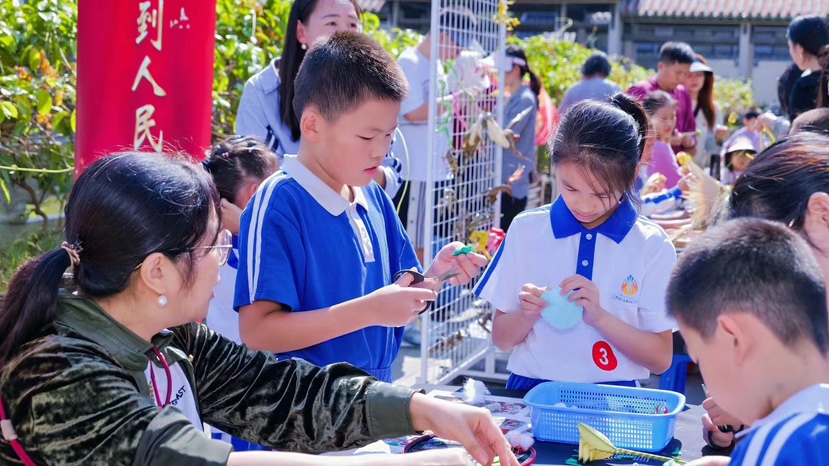活动现场,在凤凰古村的长廊,一年级的同学们在家长的陪伴下,沐浴着阳光,环视着古村落的景致,共同阅读绘本《一片叶子落下来》。随后,亲子家庭一同参与知识问答、手工制作等互动环节。凤凰古村名家工作室的老师们现场指导,家长和孩子们合作完成草编、棉塑、纸上艺术等作品,欢声笑语弥漫在古村的角落。