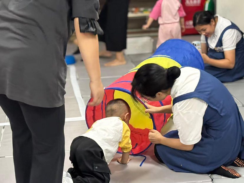 活动现场暖意融融。自我介绍环节,幼儿们在家长的陪伴与鼓励下大胆展示自己,既锻炼了语言表达能力,也快速融入集体;趣味运动环节,色彩明快的感统器材成为孩子们的“快乐主场”——有的幼儿专注搭建彩色弹簧塔,在动手操作中培养空间认知与手眼协调能力;有的小朋友在工作人员与家长的引导下钻爬趣味隧道,肢体灵活性与勇气在探索中同步提升;创意手工制作环节,亲子协作摆弄材料、完成作品,不仅锻炼了幼儿精细动作,更在默契配合中增进了情感联结。