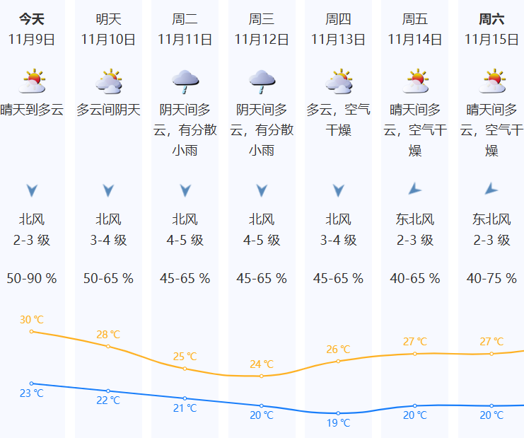预计11月9日早晨6-9时,我市晴天为主;气温23-25℃;东北风2-3级;相对湿度70%-90%;能见度普遍在5-15公里。全市(含深汕)森林火险黄色预警信号生效中,注意用火用电安全!