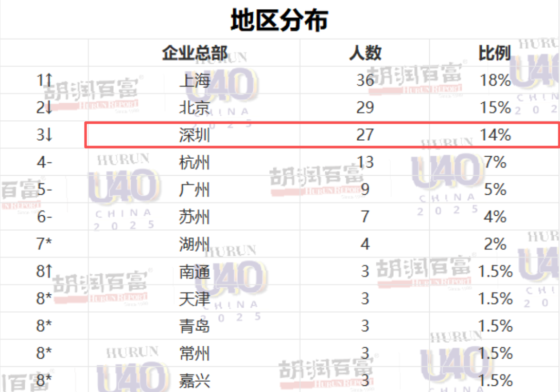 11月7日,胡润研究院发布《2025胡润U40中国创业先锋》,旨在寻找中国40岁及以下的创业先锋,深圳27人上榜,占比达到14%。报告也包括《2025胡润中国U40企业家榜》,39位个人财富50亿元及以上的U40企业家上榜,深圳占7位。