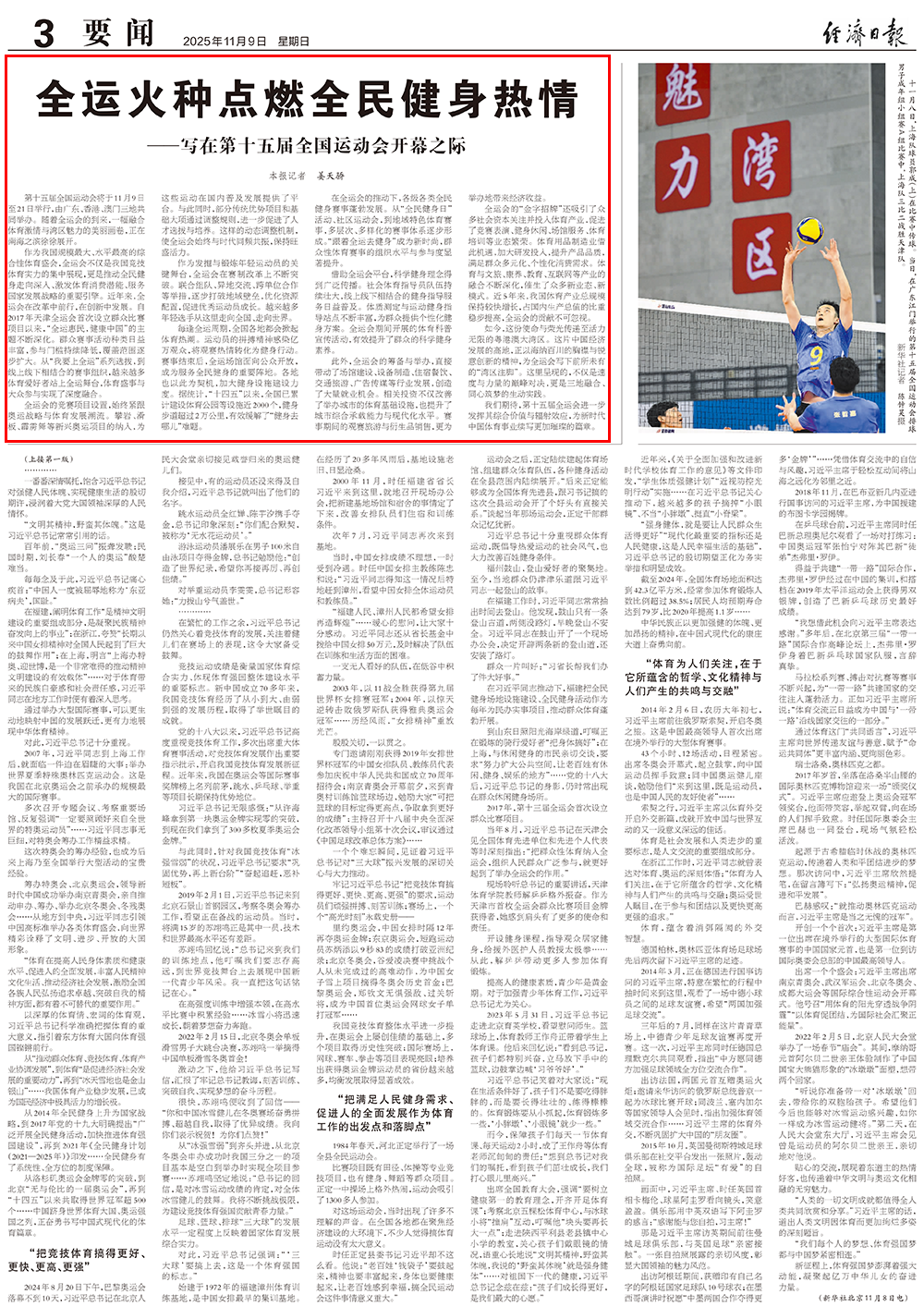今日(11月9日)出版的《人民日报》《新华每日电讯》《光明日报》《经济日报》均刊文聚焦第十五届全国运动会开幕。