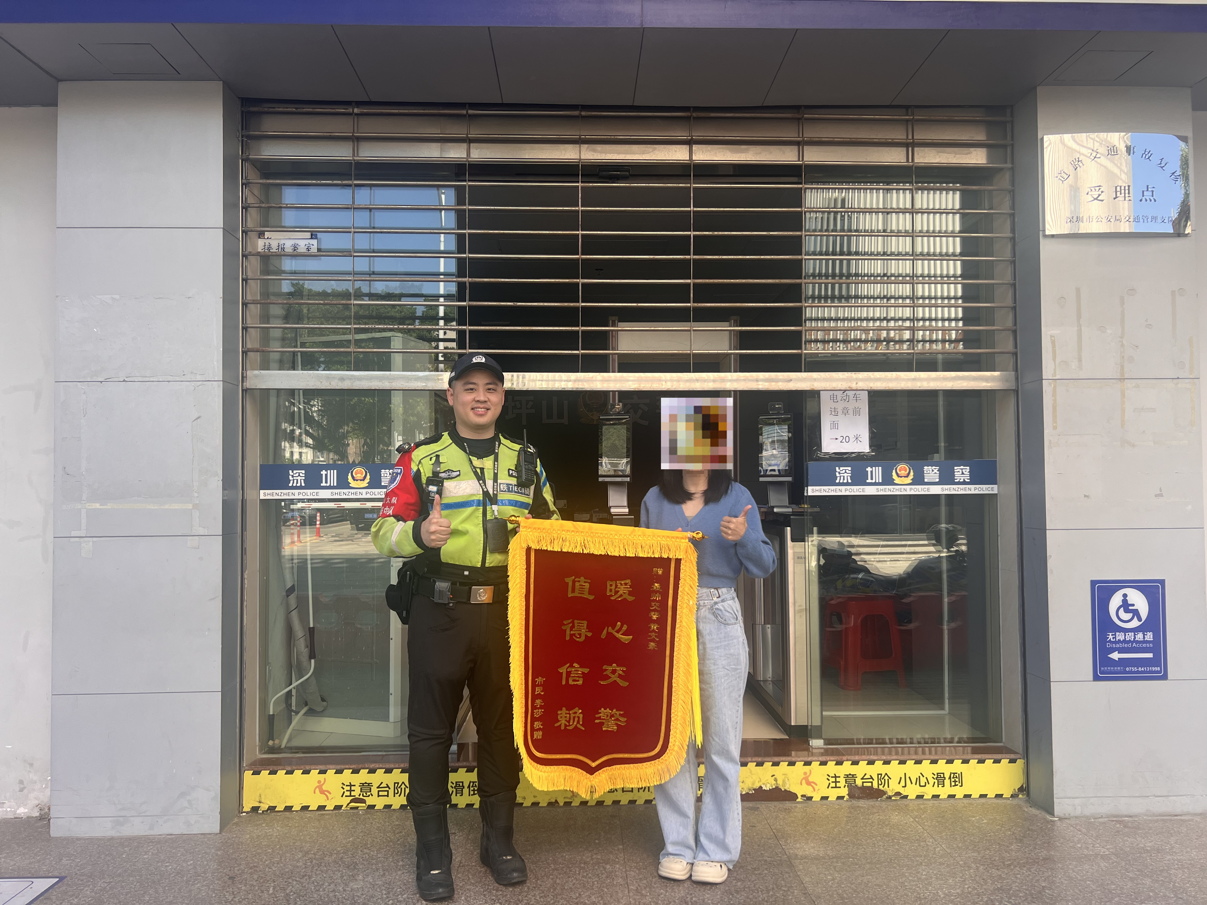 11月5日,市民李女士专程来到深圳市公安局交通管理局坪山大队,将一面锦旗连同一封手写感谢信送到铁骑队员手中,对其在处理交通事故中展现的专业素养和为民情怀表达诚挚谢意。