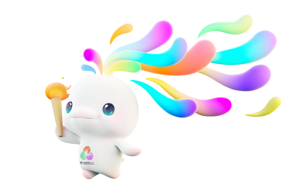 这两只萌物的头顶是三色浪花,融合了广东木棉红、香港紫荆紫和澳门莲花绿,分别代表广东、香港、澳门三个联合承办本届赛事的地区。从正面看,这三色浪花还构成了一颗爱心的形状❤️,寓意着三地同心;而为海豚添上手和脚,是为了更好表现运动姿态与动态美感。