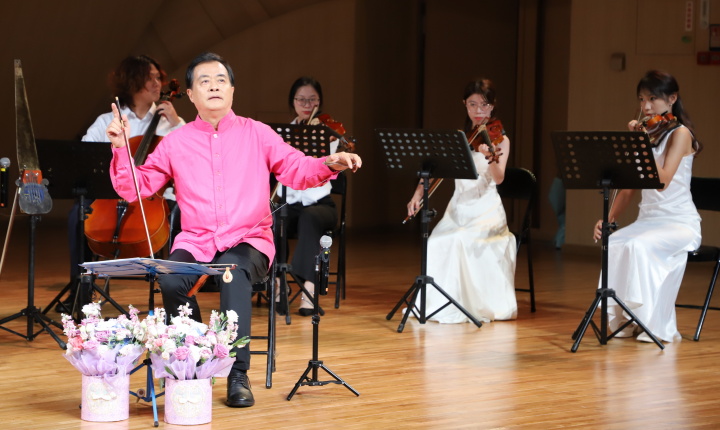 随着灯光渐暗,音乐会正场演出重磅登场,中西艺术的碰撞瞬间抓住了所有人的耳朵。屡获国际大奖的锯琴艺术家李元庆领衔主演,携手钢琴家李一豪及深圳大学四重奏乐队,为观众带来五章层次丰富、风格各异的精彩演出。在 “爱国情怀” 篇章中,《我爱你中国》的雄浑激昂与《二泉映月》的悠扬婉转,在钢琴与锯琴的默契配合下直击人心,不少观众眼中泛起了泪光。年过六旬的周先生擦拭着眼角说:“听到《我爱你中国》的时候,心里特别激动,锯琴的声音很特别,既有力量又很温柔,把那种爱国情怀表达得太到位了。”“民族特色” 篇章里,肖邦《马祖卡》的浪漫旋律与《红楼梦》主题音乐的古典雅致无缝衔接,让现场观众仿佛穿越时空,感受中西韵律的奇妙融合。