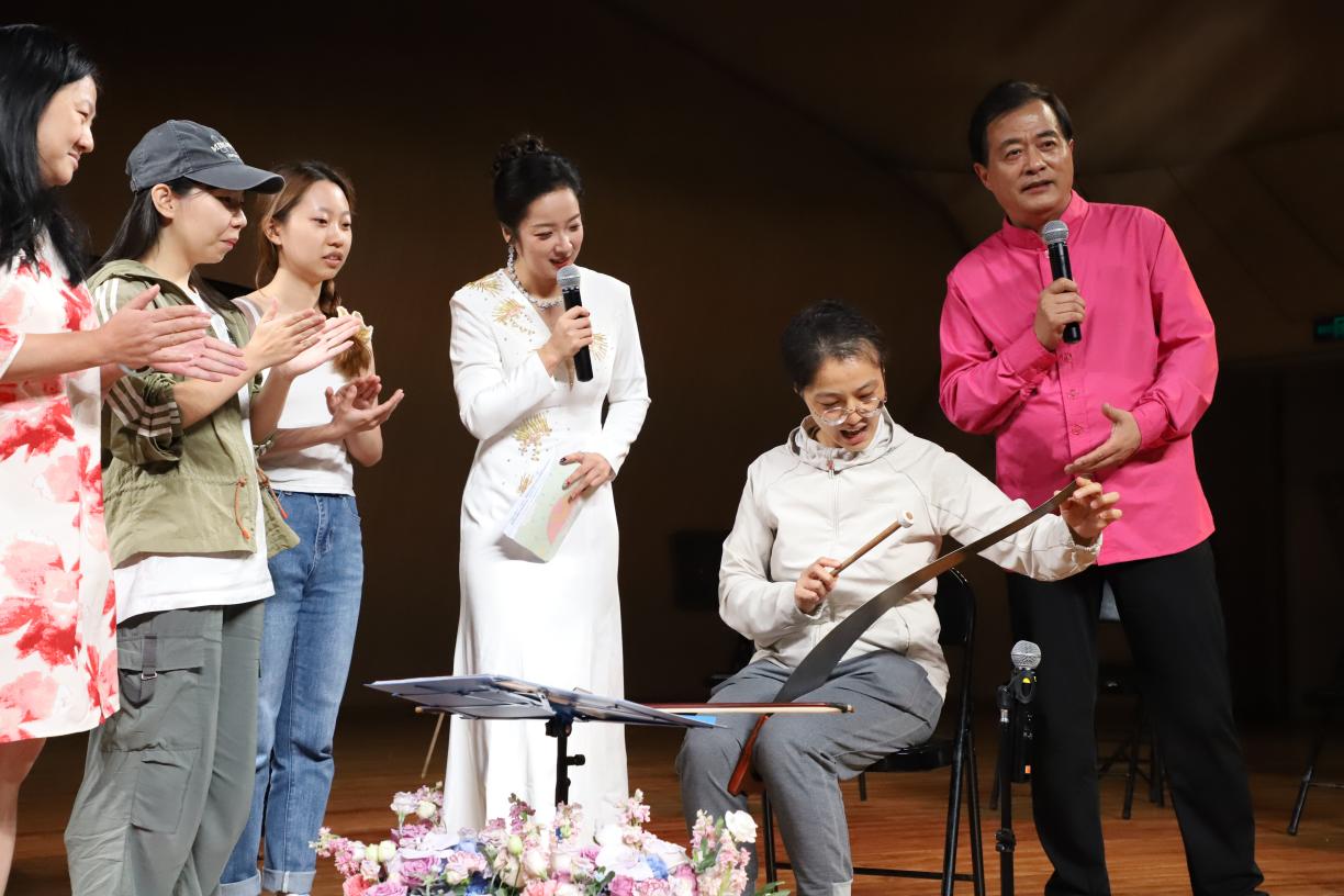而整场音乐会的 “嗨燃时刻”,当属非遗乐器团与主创团队联袂演绎的《马刀舞曲》。非遗乐团的古筝演奏家王燕、陶笛演奏家靳于群、三弦演奏家刘启铭、中阮演奏家张天尧、古筝演奏家詹龙女,与李元庆、李一豪默契配合——锯琴的灵动、古筝的悠扬、陶笛的清脆、三弦的醇厚、中阮的深沉交织在一起,将《马刀舞曲》的激昂与豪迈展现得淋漓尽致。当熟悉的旋律响起,现场观众不自觉地跟着节奏轻轻点头,随着乐曲进入高潮,不少观众起身鼓掌欢呼,掌声与欢呼声此起彼伏,整个音乐厅瞬间变成了欢乐的海洋。“太燃了!我鸡皮疙瘩都起来了!”市民吴先生激动地站起身鼓掌,“以前听《马刀舞曲》都是交响乐版本,这次加了锯琴和这么多民族非遗乐器,感觉更有冲击力,每一个音符都像在心里‘炸’开,太过瘾了!” 坐在后排的大学生林同学一边录像一边喊:“这才是非遗该有的样子!又潮又有力量,我已经在跟同学安利锯琴了,下次有相关活动我肯定还来!”