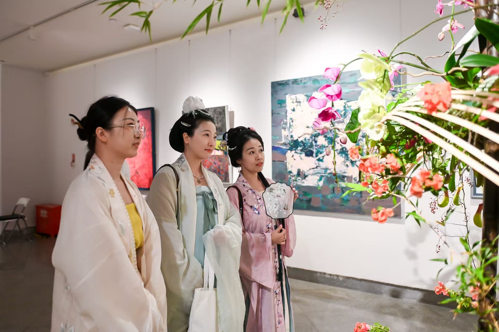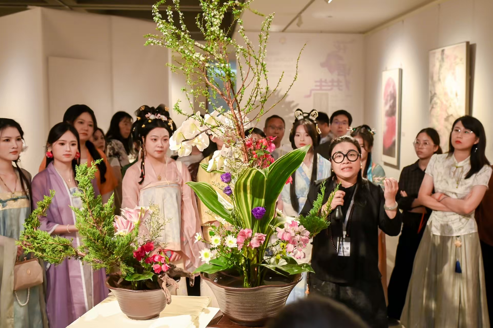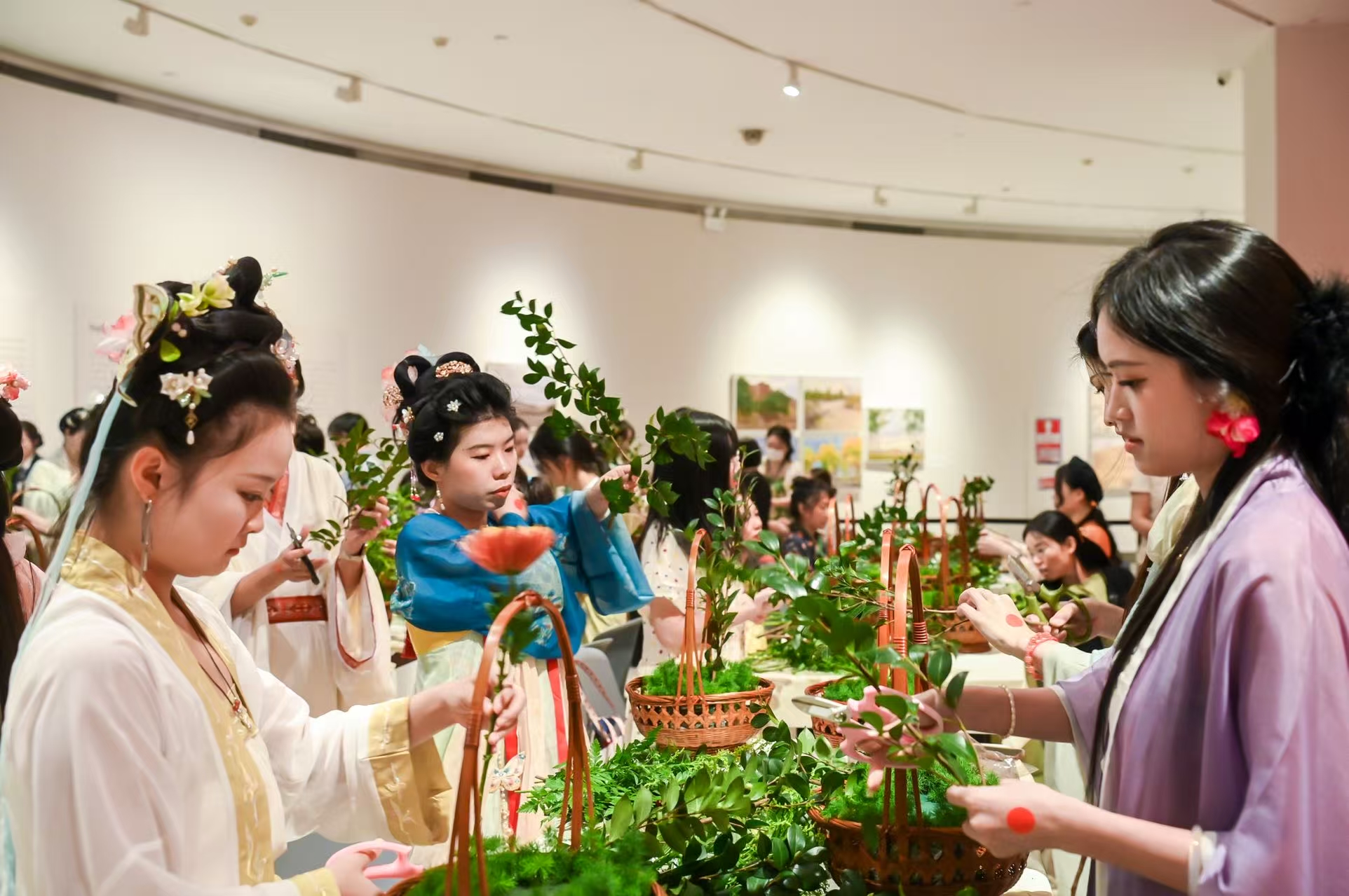 月光花影交相照,香气幽情共绕梁!活动尾声,观众身着汉服,手持亲手制作的插花作品合影留念。这一刻,他们宛若穿越时空的簪花仕女,与展厅内的花艺作品相映成趣,在现代美术馆中留下传统文化的生动注脚,也在每一位观众心中留下一份独特的美术馆之夜记忆。“来到这里,不仅学到了插花技艺,更深度体验了传统文化的魅力。”一位观众表示,这种沉浸式的文化活动让她对深圳的城市文化有了新的认识。