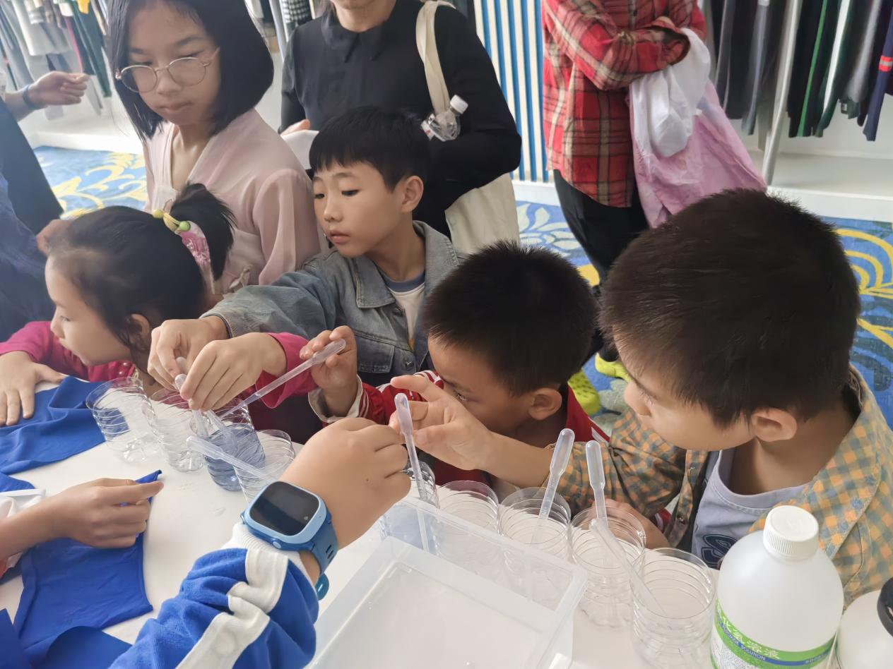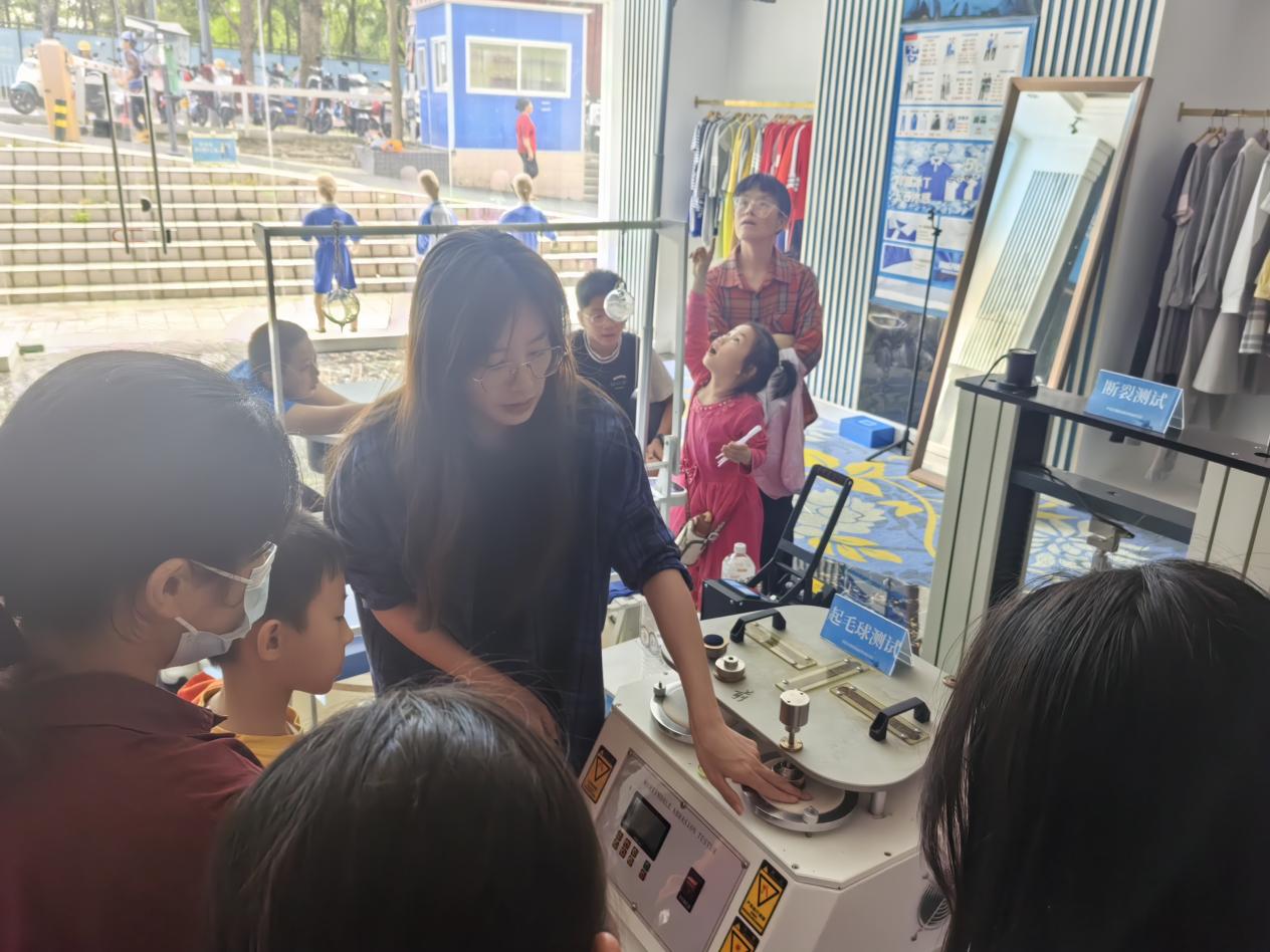 在“现代服装工艺体验区”,讲解员结合本土企业奔霓诗的校服生产,巧妙地将话题从历史拉回现实。讲解员一边介绍深圳校服的制作工艺,一边指导孩子们动手实践。孩子们拿起滴管,在不同材质的校服上做实验,对比不同面料的亲水性。当看到水滴滴在速干校服上瞬间消失不见时,现场爆发出阵阵惊叹声。
