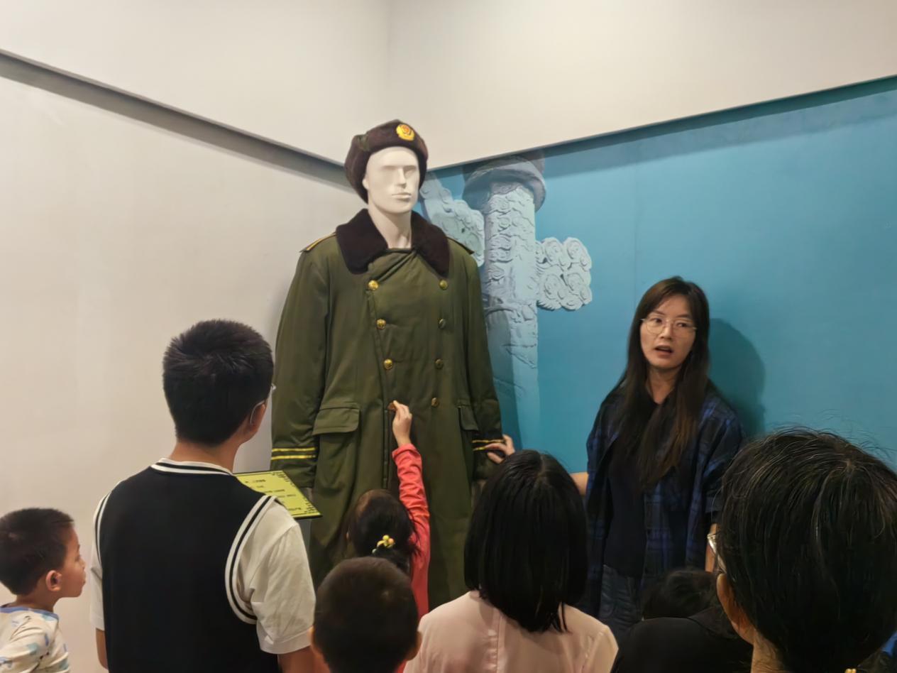 “商朝青铜甲胄体现了当时青铜冶炼技术的成熟,而宋朝布面甲的普及,则与棉花种植推广、纺织技术提升密不可分。”在博物馆讲解员的带领下,孩子们首先走进“古代军装展区”。从商朝的青铜甲胄、秦朝的皮质铠甲,到唐宋的布面甲、明清的棉甲,再到现代的迷彩作战服、警用常服,讲解员以“生产力发展”为主线,细致讲解不同时期军装的制式、材质与功能。孩子们不时驻足观察展台上的实物,触摸复制品的纹理,眼中闪烁着对历史的好奇。