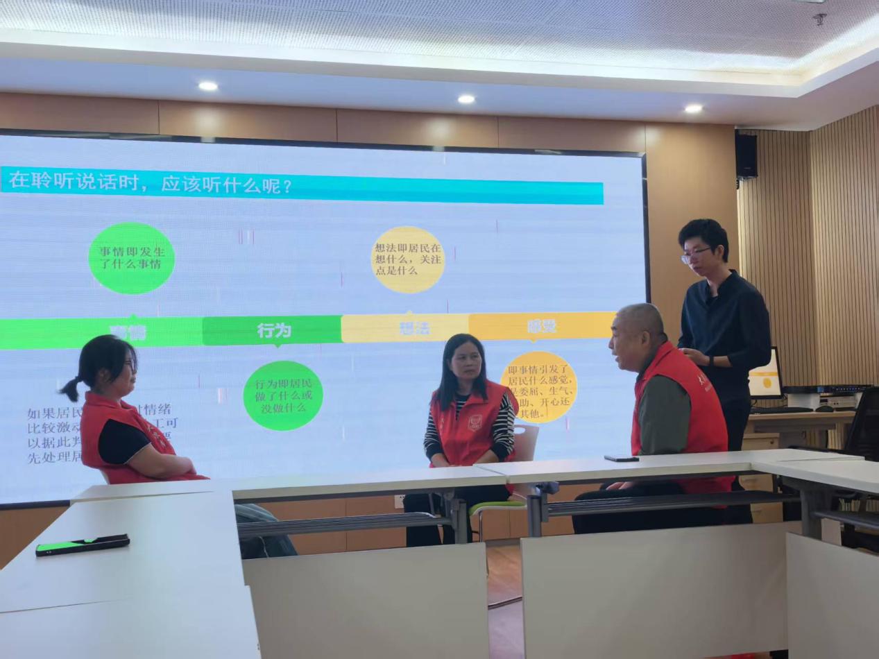 在模拟演练环节,志愿者轮番上阵,从敲门问候到深入交谈,完整模拟入户探访全流程。指导老师化身“导演”与“评委”,对志愿者的表现进行细致点评与精准“纠偏”,帮助大家在实战前扫清盲区、巩固所学。