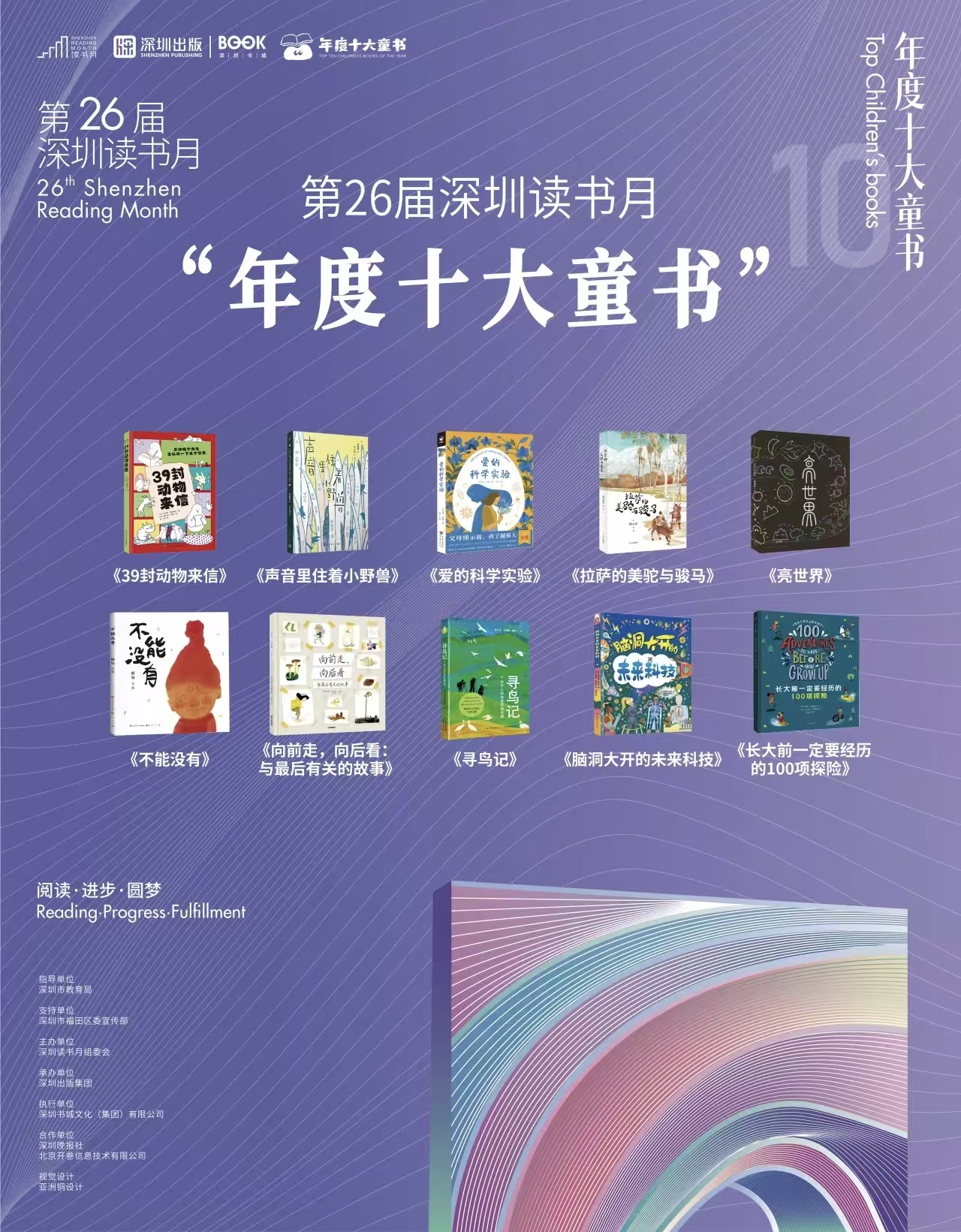 11月9日,第二十六届深圳读书月“年度十大童书”评选颁奖典礼暨揭晓礼在深圳书城中心城南区大台阶举行。经过基础书目、初评、复评、终评四轮严格筛选,《39封动物来信》《声音里住着小怪兽》《爱的科学实验》《拉萨的美驼与骏马》(儿童文学类)《不能没有》《向前走,向后看:与最后有关的故事》《亮世界》(图画书类)《长大前一定要经历的100项探险》《寻鸟记》《脑洞大开的未来科技》(知识性读物)共计10部作品从数百种童书中脱颖而出,最终摘得第二十六届深圳读书月“年度十大童书”桂冠。