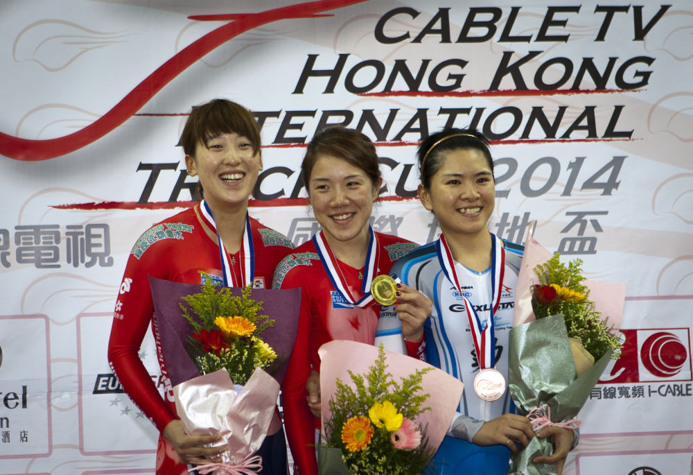 资料图:2014年1月11日,在香港将军澳自行车馆举行的国际场地杯自行车赛女子精英个人追逐赛中,香港选手包揽冠亚军。图为香港车手黄蕴瑶(中)和杨倩玉(左)在颁奖仪式上。新华社记者 何靖嘉摄