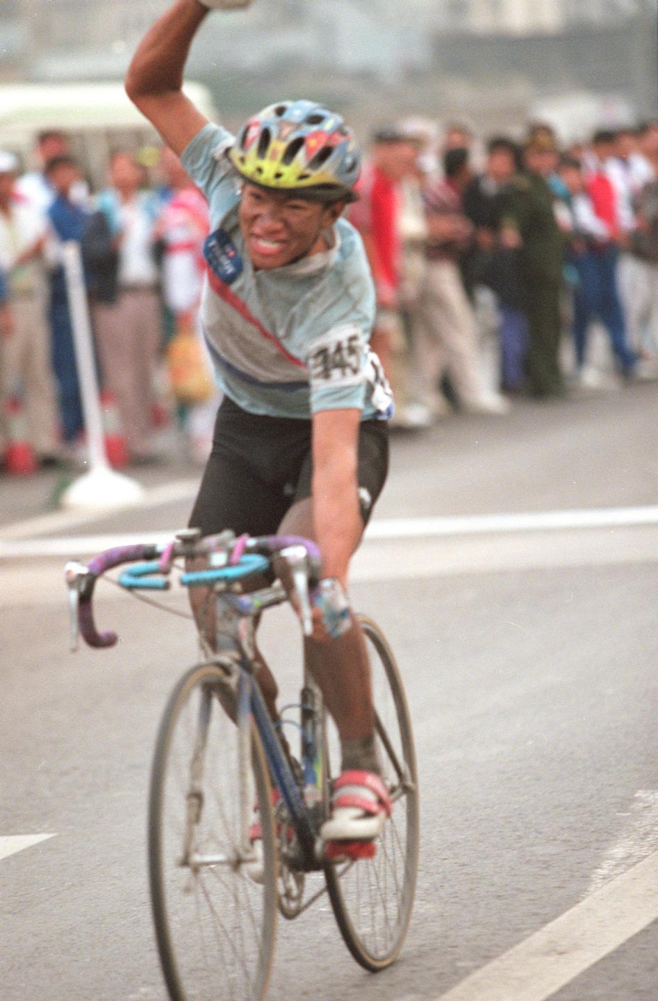 资料图:1997年10月15日下午,在八运会自行车比赛男子180公里个人赛中,黄金宝以4小时10分7秒50的成绩,为香港代表团获得首枚全运会金牌。新华社记者 任珑 摄