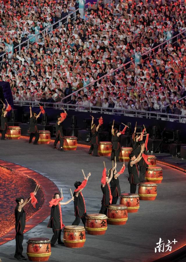11月9日,第十五届全运会在广州开幕。在暖场节目四个篇章中,潮州二十四节令鼓震撼开场,150名青少年鼓手以青春之鼓擂动传统之声,点燃全运会开幕式现场气氛。