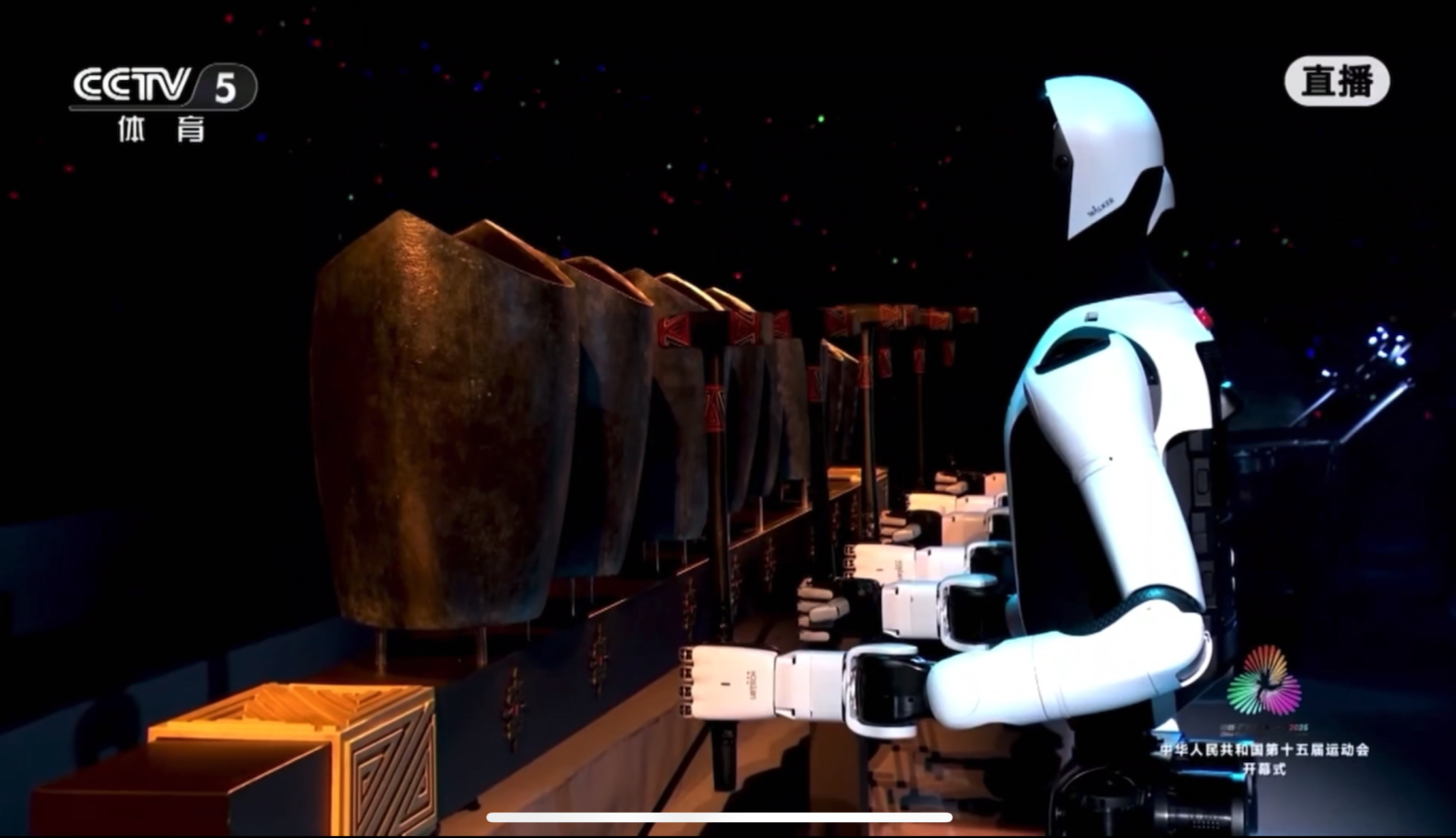 在开幕式文体展演的第一个节目中,三台Walker S2面向舞台上的8件特殊乐器—— 广州南越王墓出土的“文帝九年”青铜句鑃,手持击槌奏响悠扬庄重的开幕曲《彩云追月》。这组距今超两千年的文物,承载着岭南独特的文明记忆,是我国古代礼乐文化与青铜铸造工艺的双重瑰宝。
