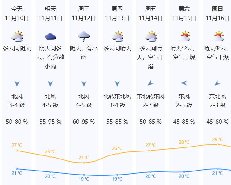 11-12日,东部偏东市县多云转小到中雨局部暴雨,其余市县晴到多云。最低气温:粤北的偏北市县14~16℃,南部沿海市县19~22℃,其余市县17~19℃。
