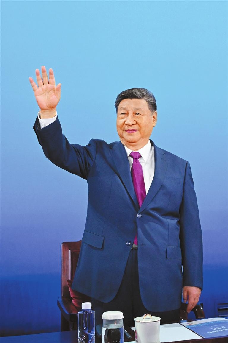 ▲习近平在主席台上向大家挥手致意。 新华社发