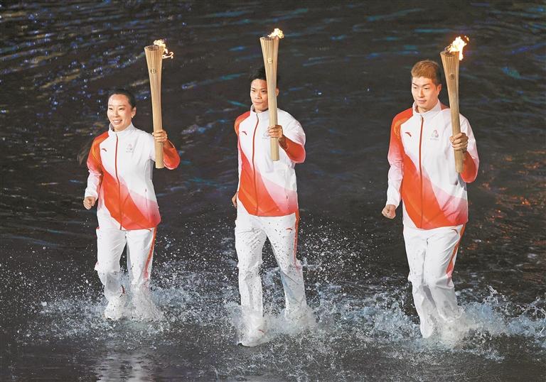 ▲火炬手苏炳添(中)、张家朗(右)、李祎在开幕式现场跑向主火炬。