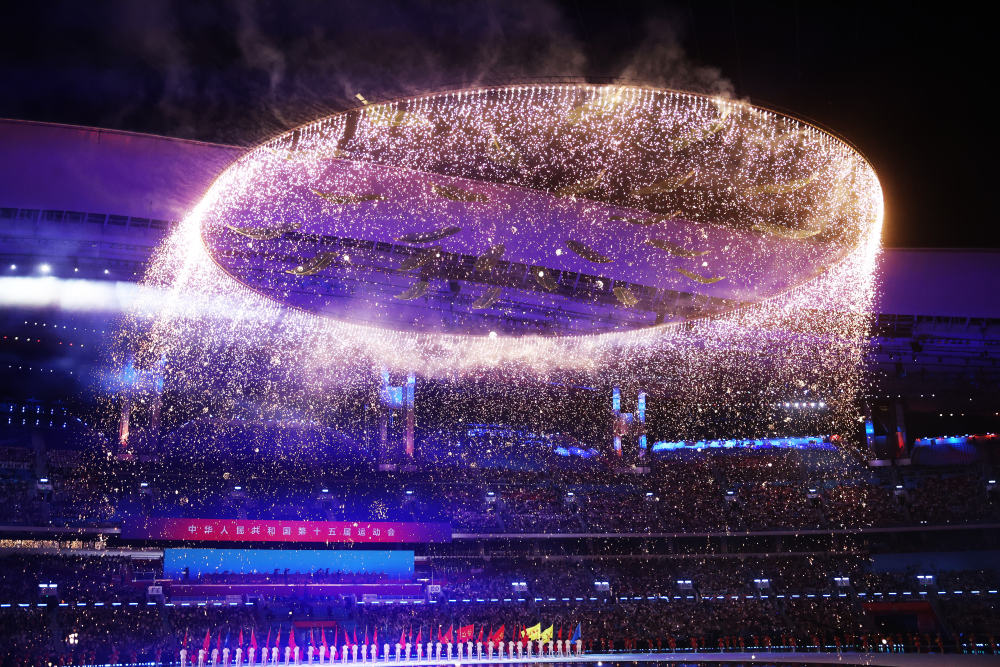 旗手护送中华人民共和国运动会会旗和第十五届全国运动会会旗入场。新华社记者 卢汉欣 摄