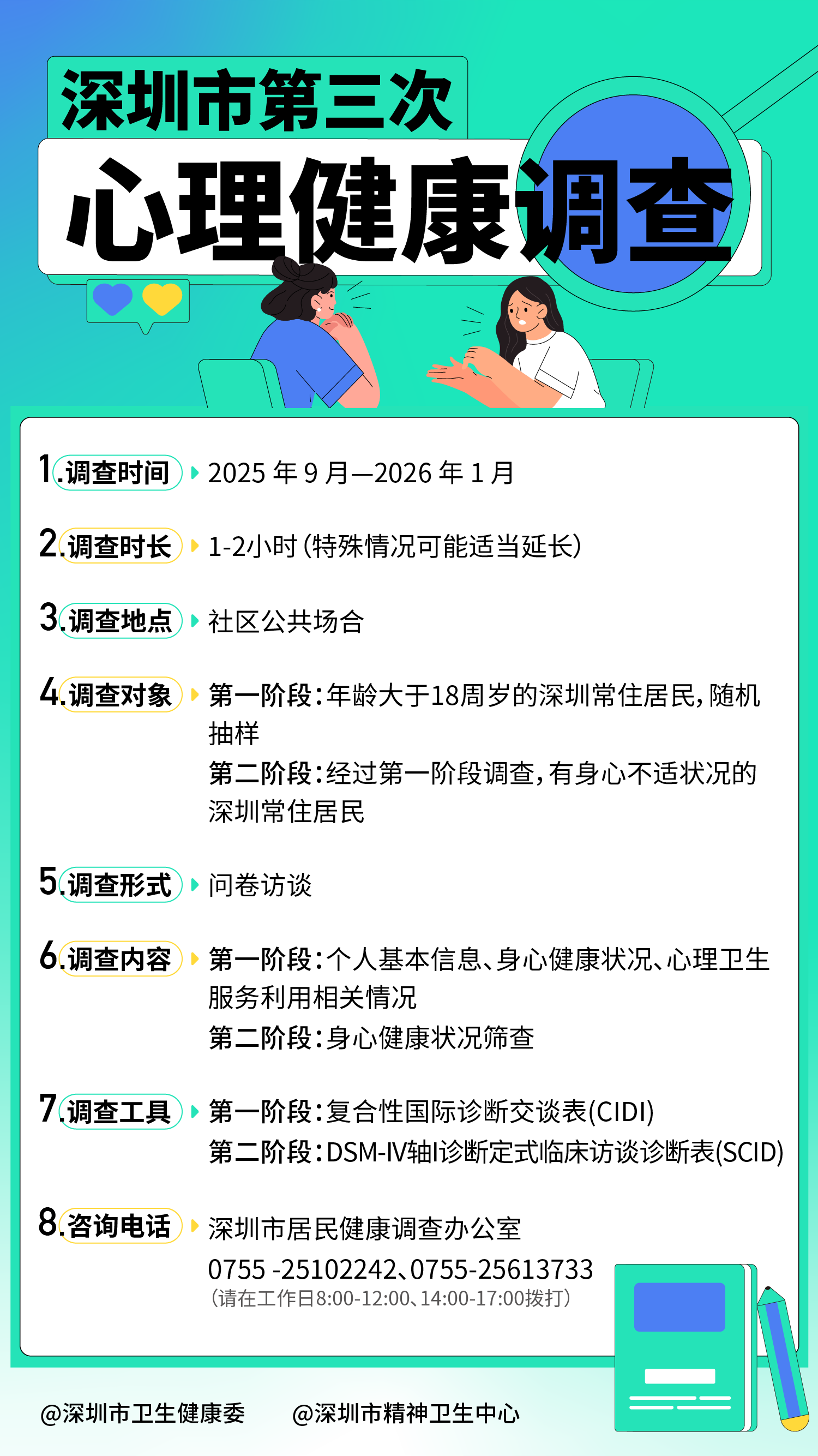 心理健康和精神卫生关系人民健康幸福和经济社会发展,为掌握市民最新“心理画像”,给相关政策制定提供科学依据,今年8月,深圳启动第三次心理健康调查。深圳市卫健委牵头5个部门,在全市78个街道和725个社区,随机抽取11940名18岁及以上的常住居民接受调查。241名具有公共卫生、精神卫生、社会工作、心理相关背景的专业人员,已通过统一培训正式“上岗”,预计在2026年2月完成本次“流调”。
