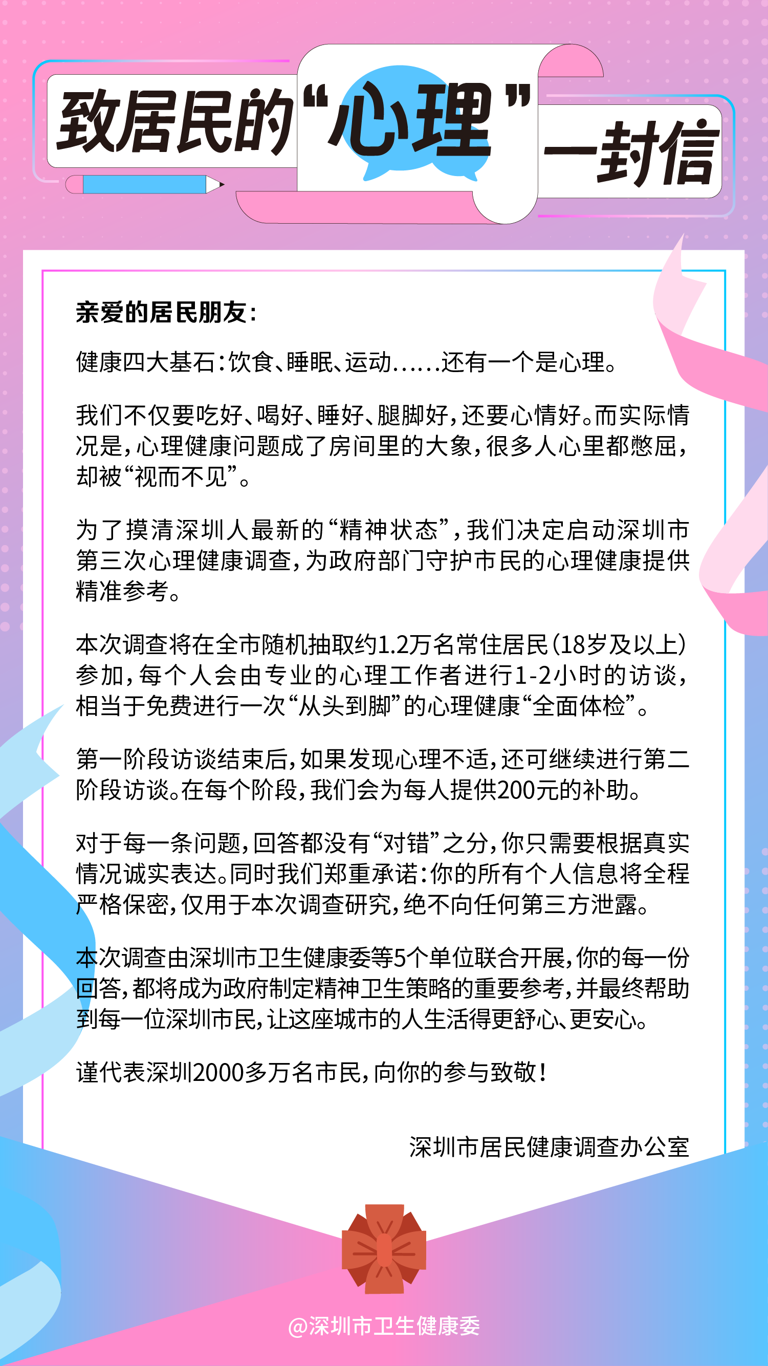 “您好,我们深圳市正在开展一项居民健康调查,正好抽到您,希望能配合我们一下......”