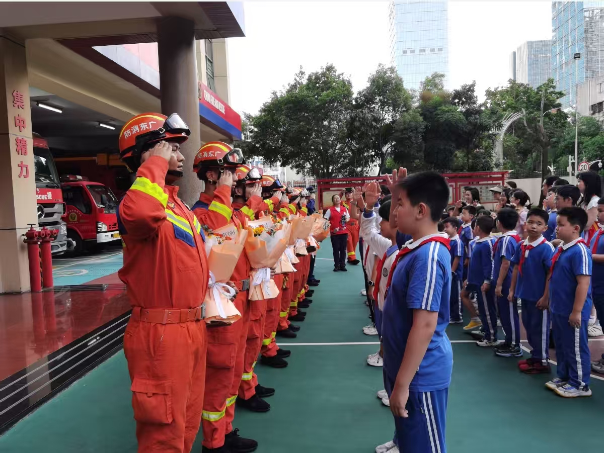 活动尾声充满温情,儿童代表向消防员献上鲜花,有的儿童则送上自制小礼物,用最纯真的方式表达对“火焰蓝”英雄的崇高敬意。全体参与人员与消防员在消防大门前合影,将这份难忘记忆定格。