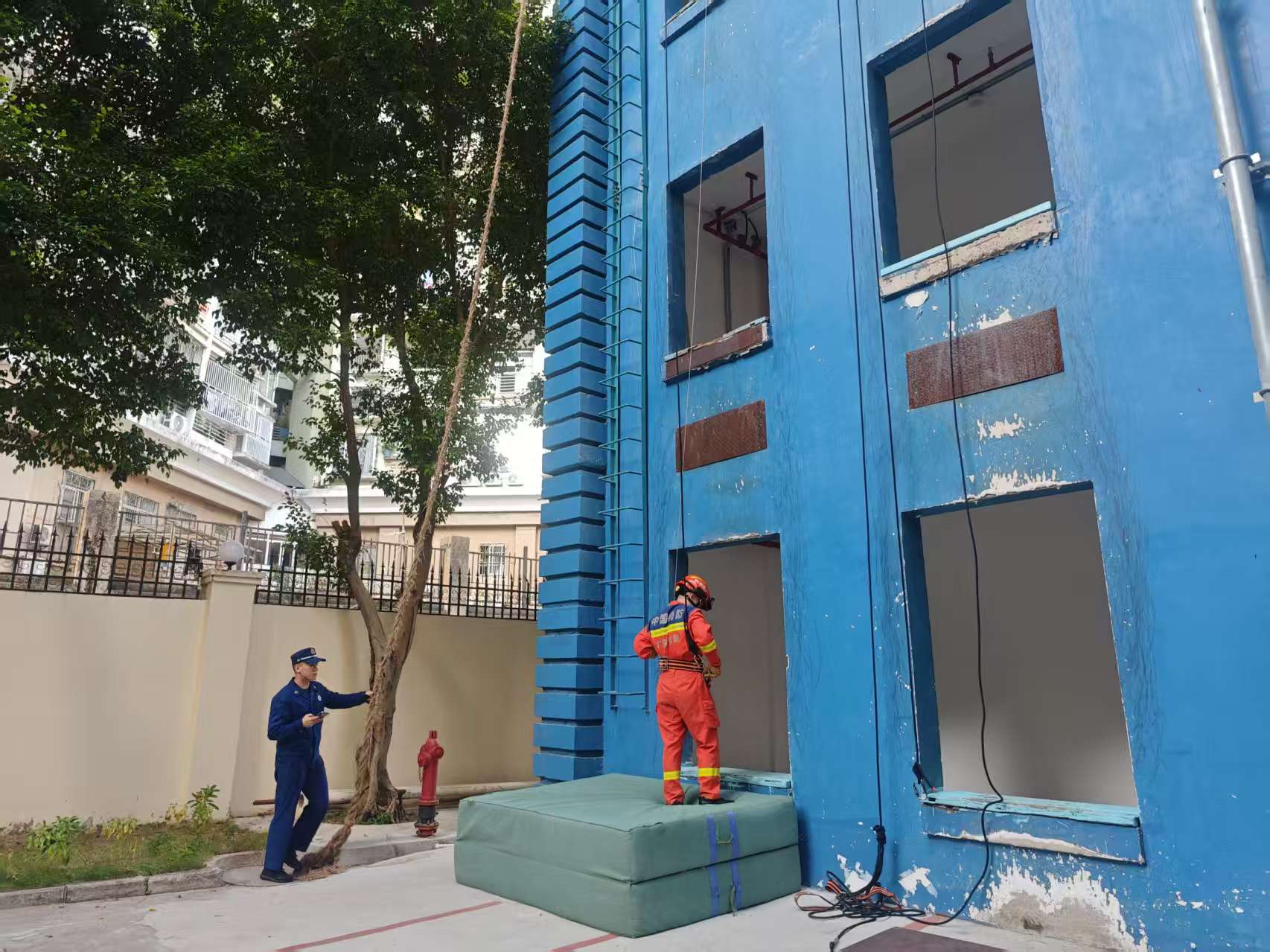 随后,他们又演示安全绳撤离与缓降器使用,从高处平稳降至地面,动作精准规范,尽显过硬专业技能与良好心理素质。